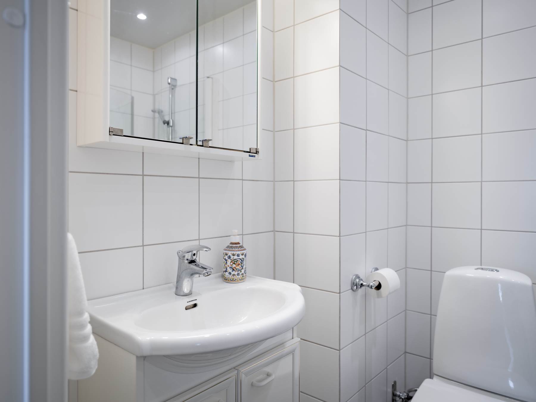 På entréplanet finner du ett välplanerat sovrum med en rymlig klädkammare en suite. Här finns även ett av bostadens två badrum – praktiskt placerat för både vardag och gäster.