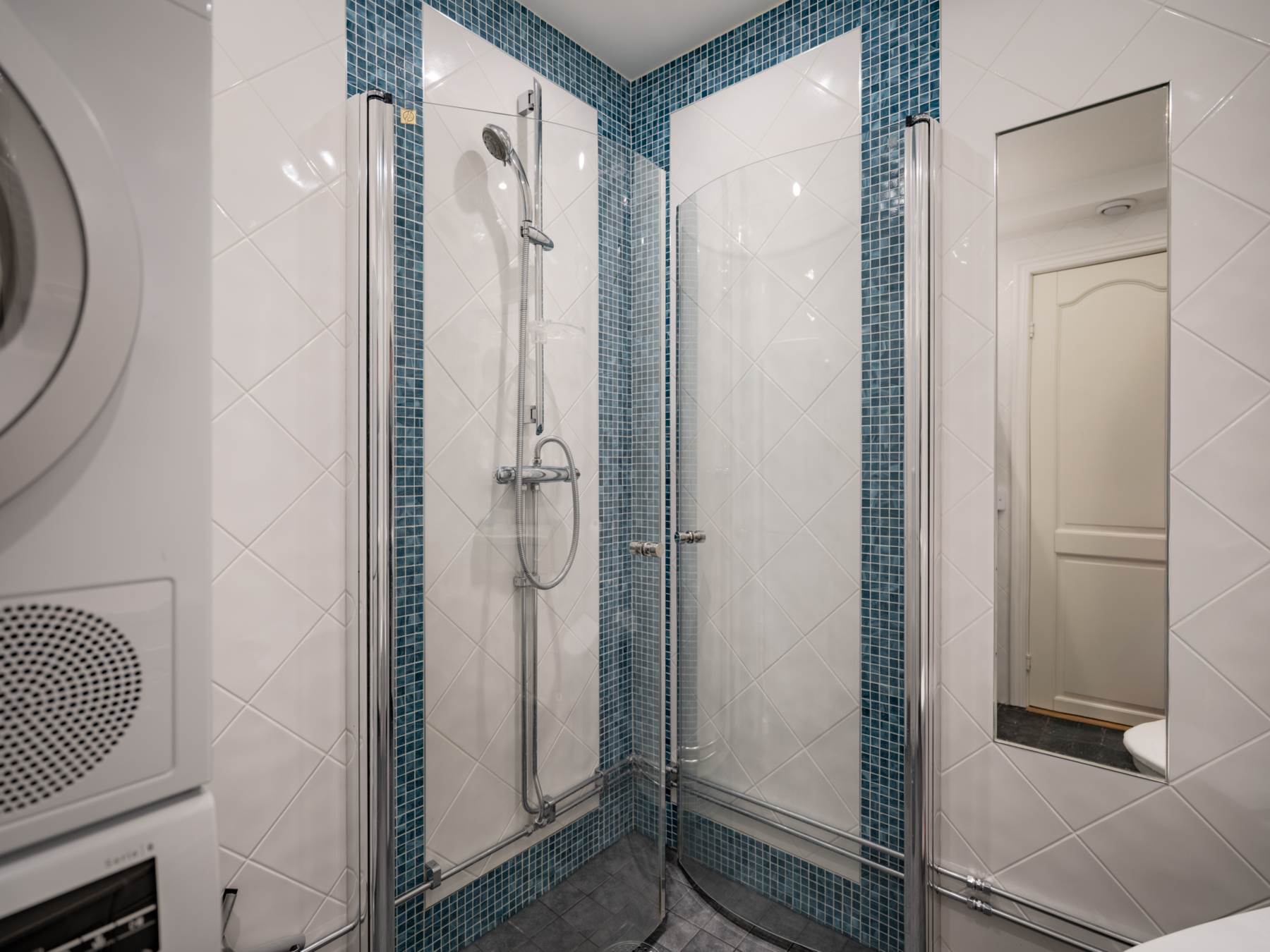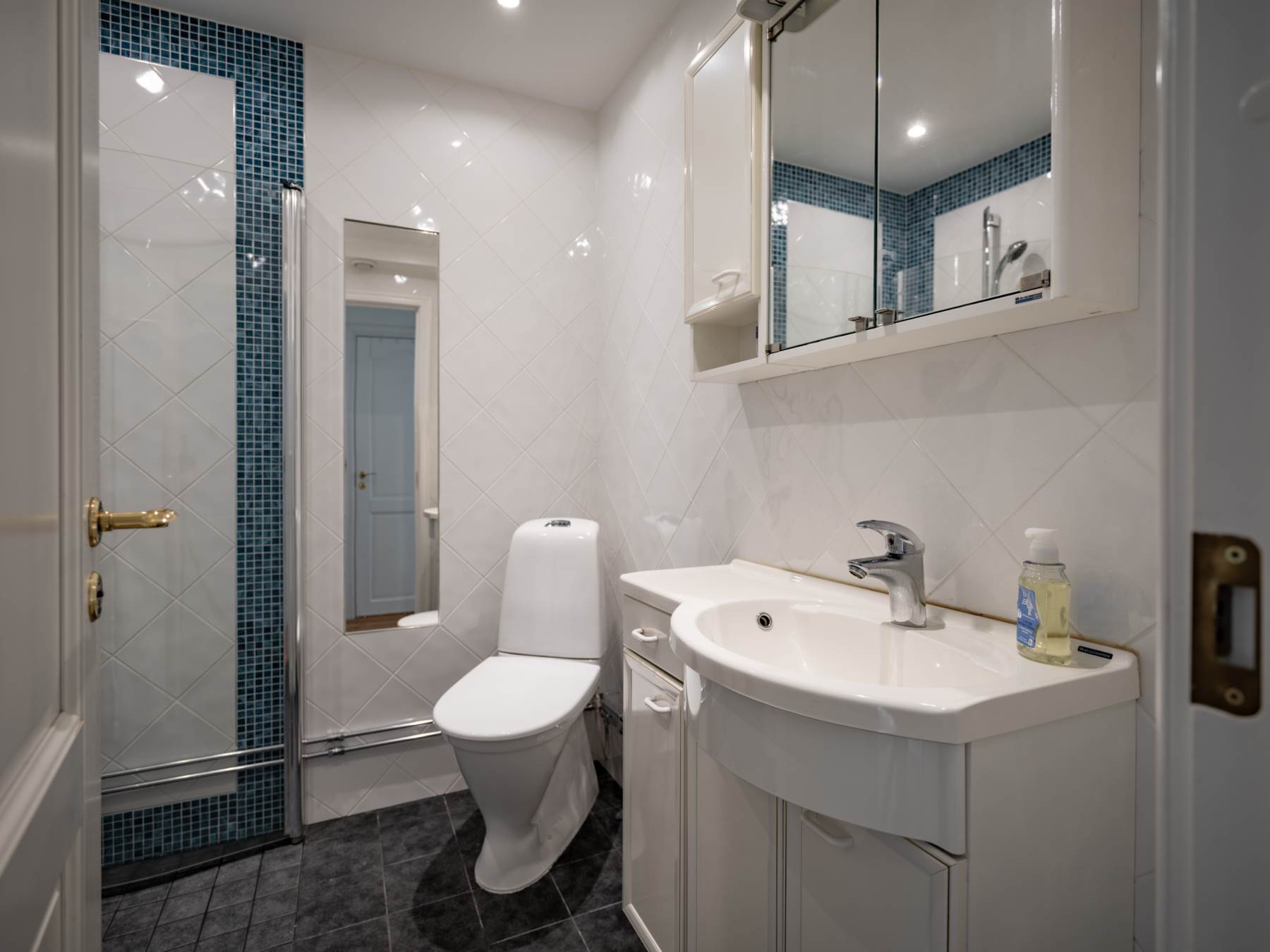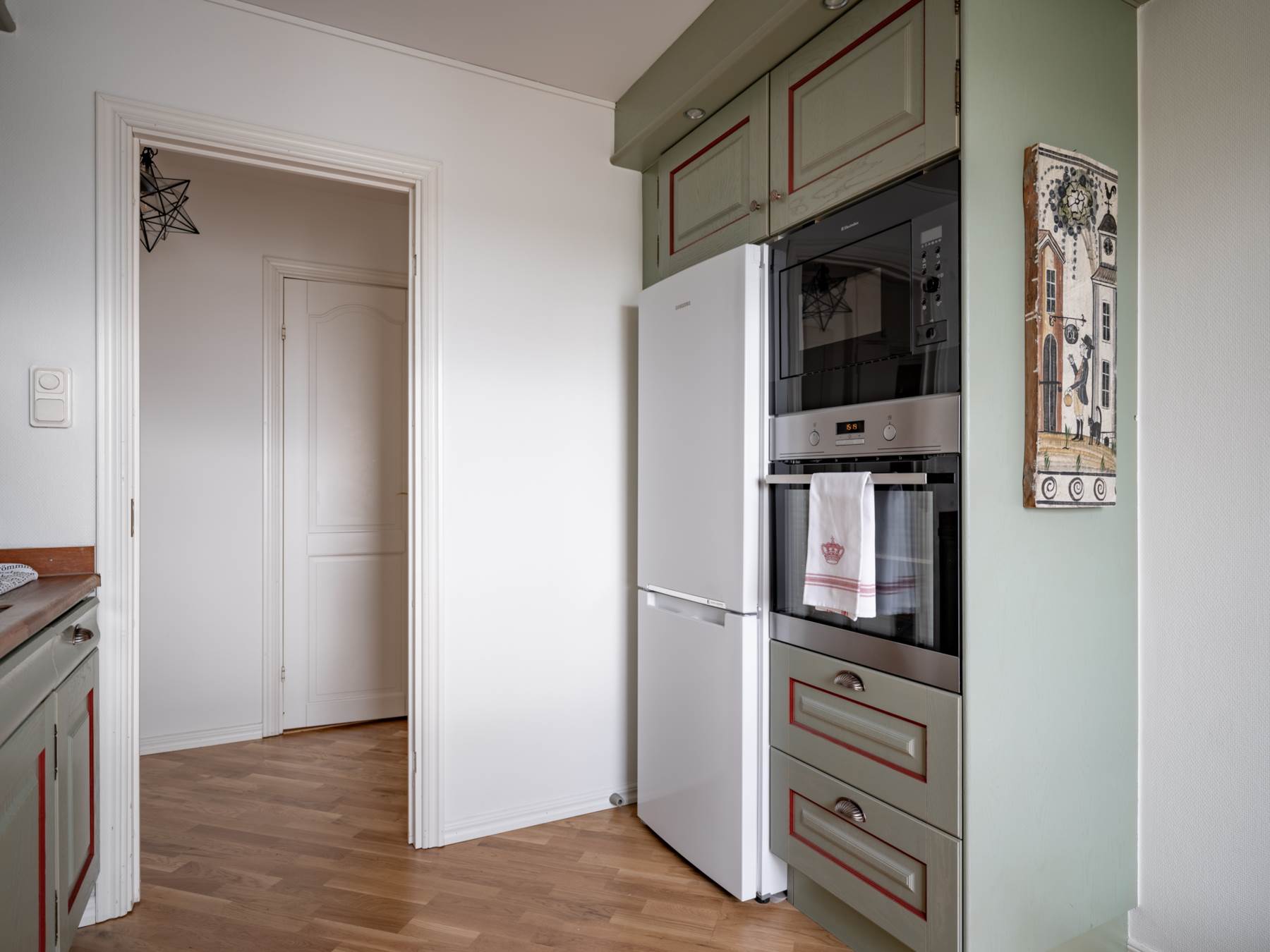 Övre plan bjuder även på ett elegant vardagsrum samt utgång till en härlig terrass med markis – perfekt för soliga dagar och ljumma kvällar. Det fantastiska solläget gör detta till en given favoritplats under årets varmare månader. Här uppe finns även det andra badrummet, utrustat med tvättpelare som ger extra bekvämlighet i vardagen.