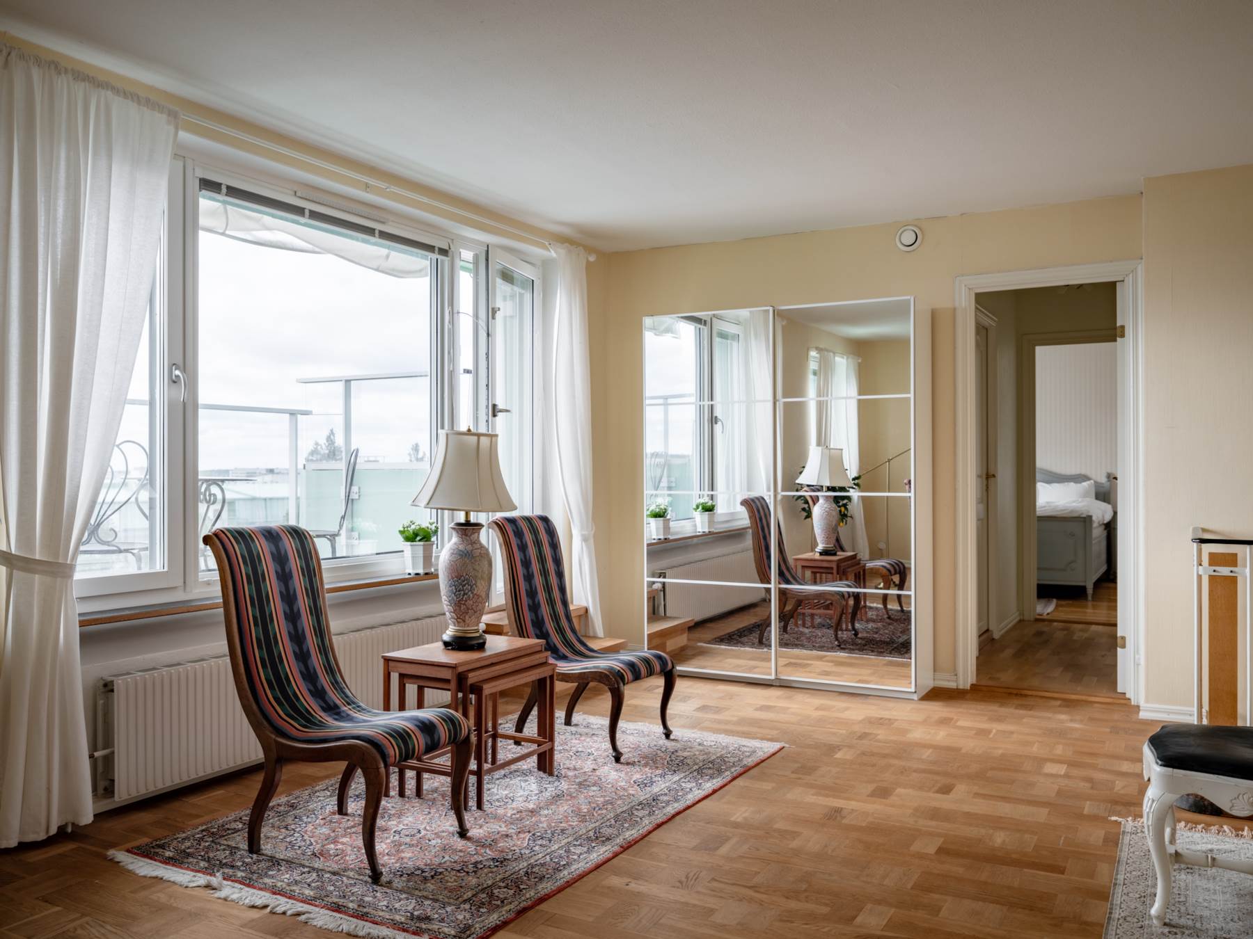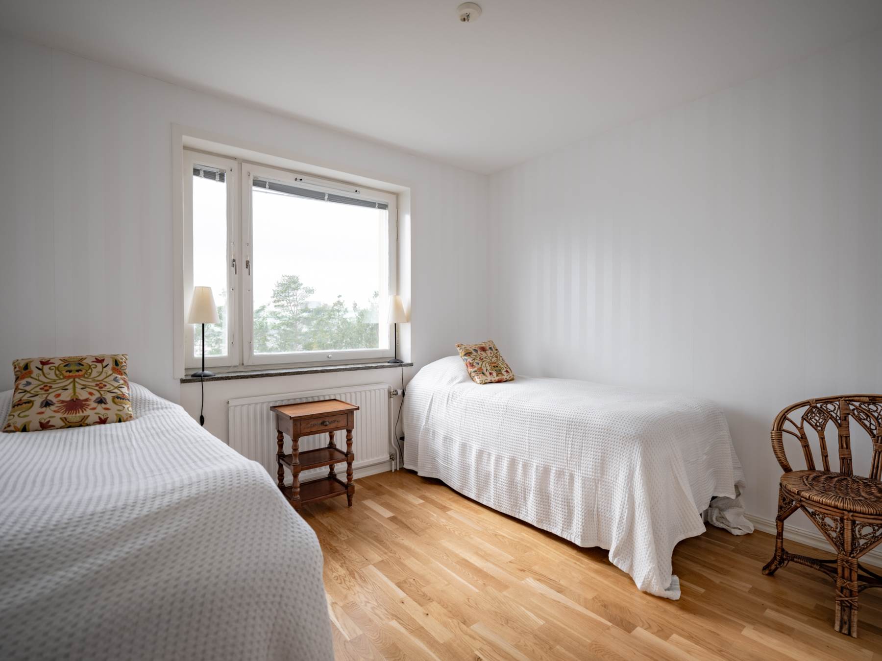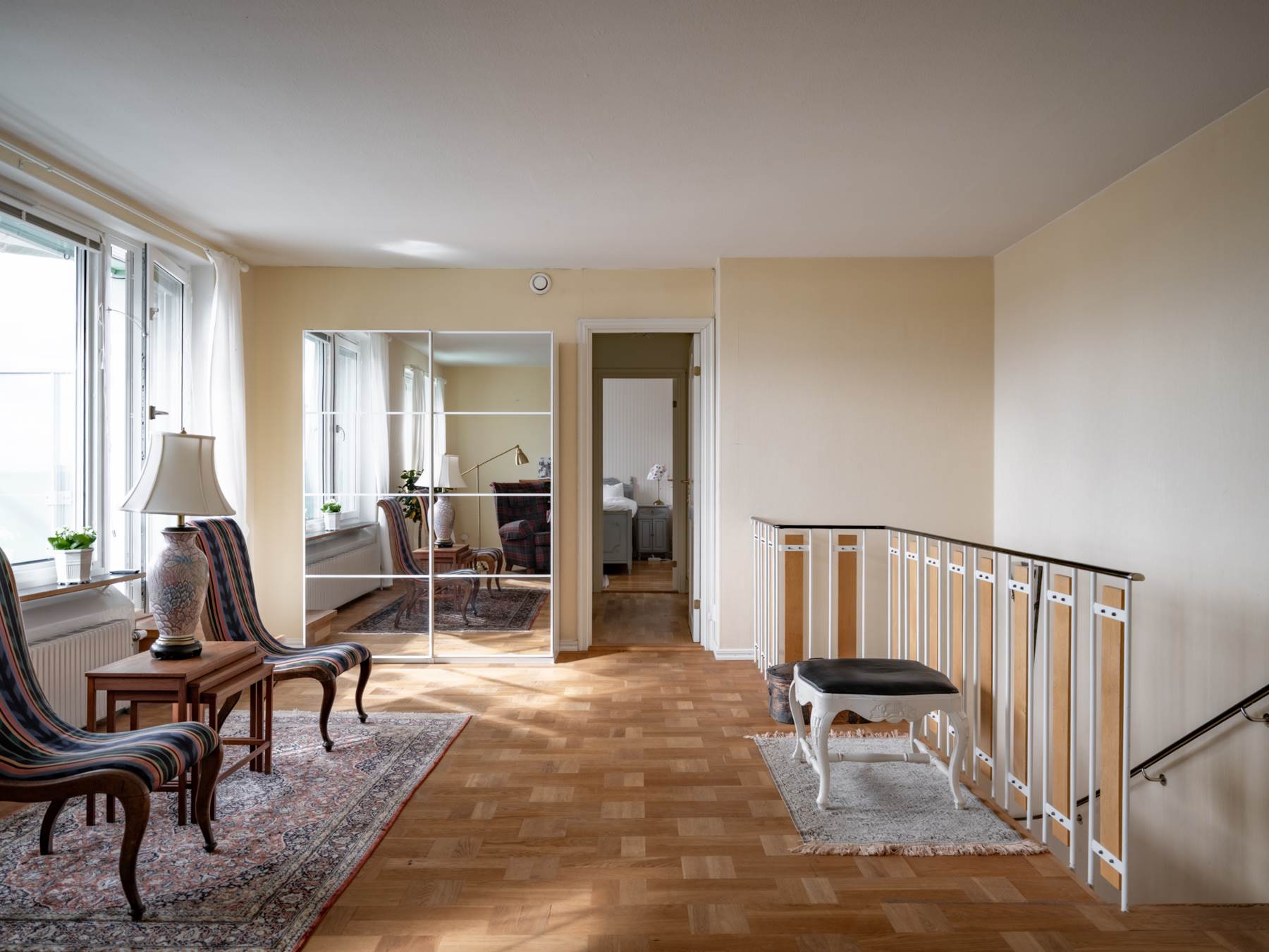 Det andra sovrummet är generöst tilltaget och beläget på övervåningen, vilket skapar en privat och avskild känsla. Även här finns en klädkammare intill sovrummet för klädförvaring etc.