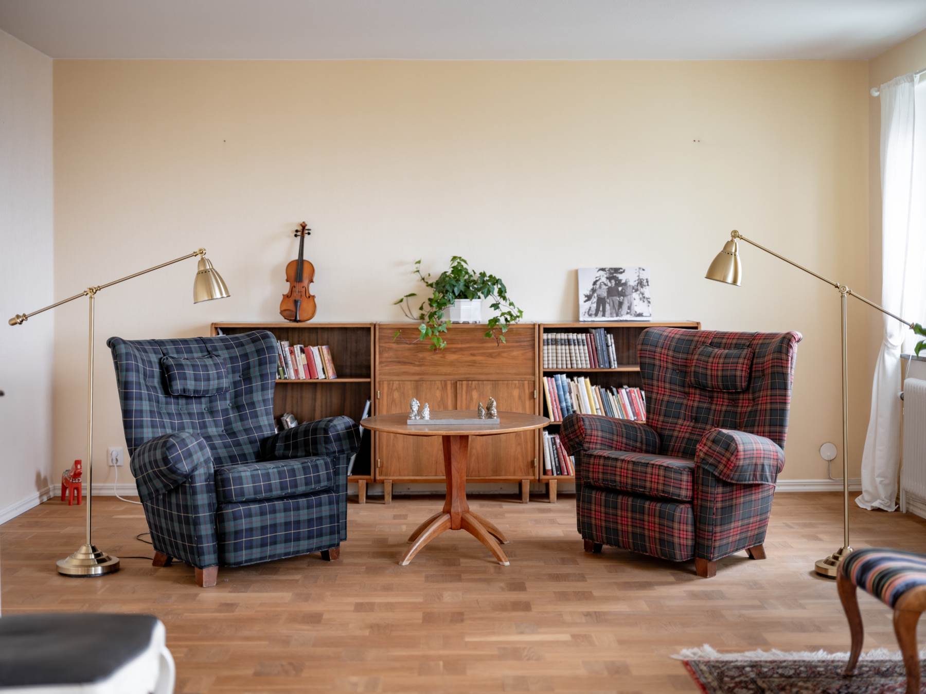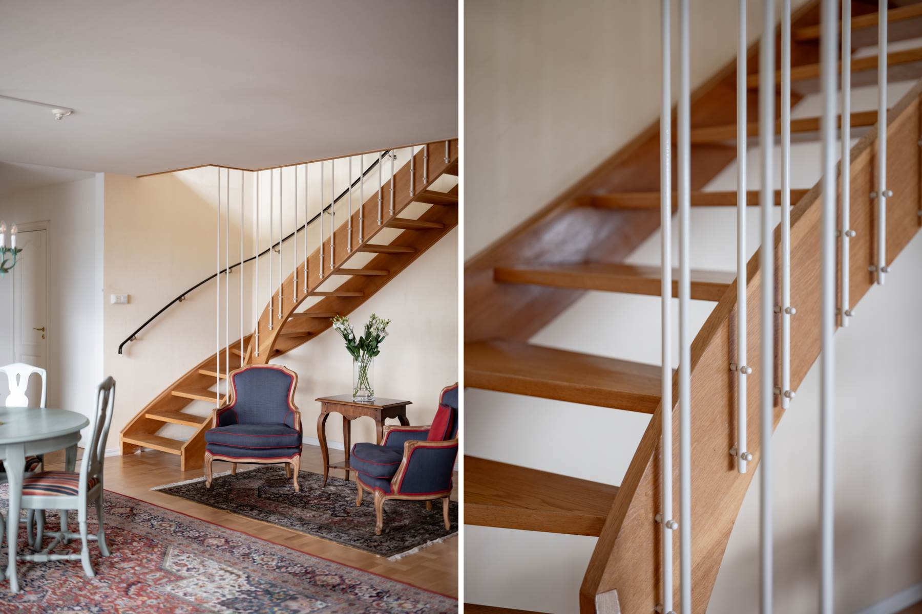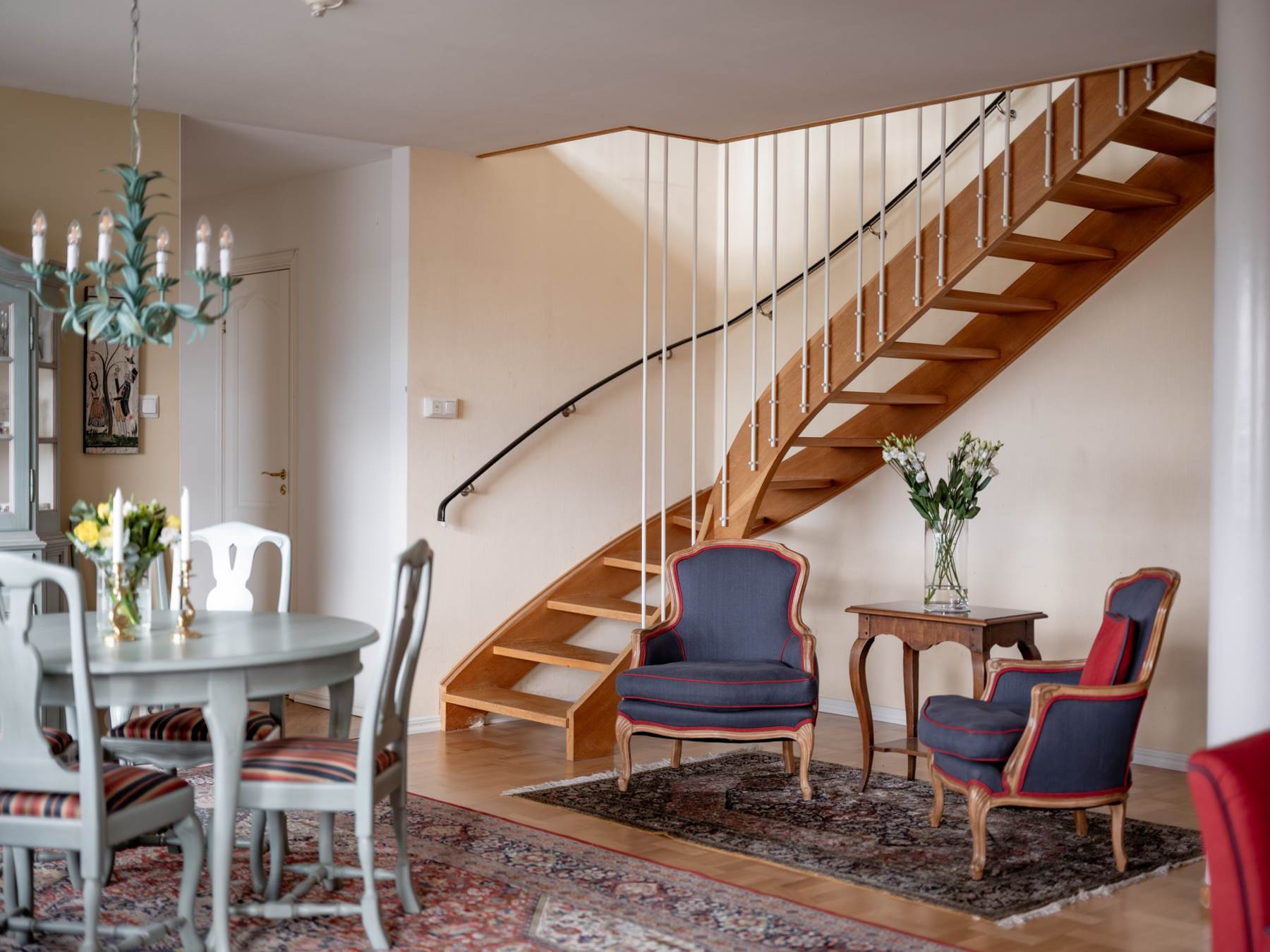 Bostaden erbjuder en genomtänkt planlösning i två plan med generösa sällskapsytor och dubbla vardagsrum som skapar flexibilitet för både sociala tillställningar och avkoppling. Ljuset flödar in genom stora fönsterpartier och förstärker den öppna och inbjudande känslan.