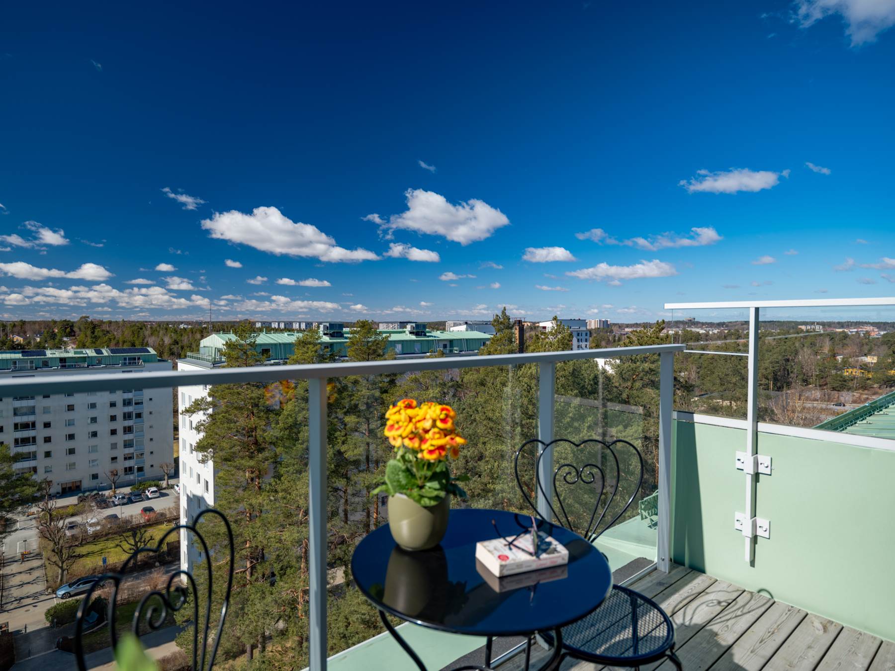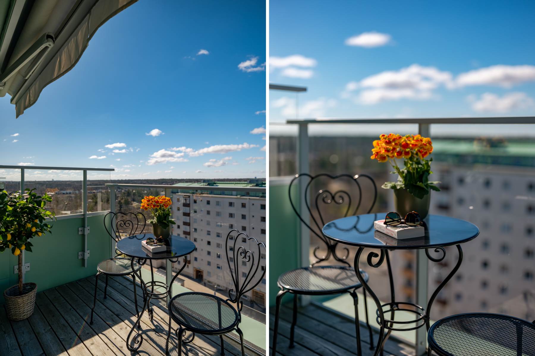 Varje port har tillgång till en gemensam medlemsterrass på ca 12-15 m2 som finns högst upp på våning 9. Du kommer dit med hiss till våning 8 och sedan tar du trappan en våning till och öppnar med din tag. Medlemsterrasserna är möblerade med bord och stolar och till för alla medlemmar att njuta av. Föreningens allmänna trivselregler gäller även på dessa medlemsterrasser och det är förbjudet att ha levande ljus, grill eller någon annan form av eld. Allt du tar med dig upp för att äta eller dricka ansvarar du också för att ta med dig därifrån.