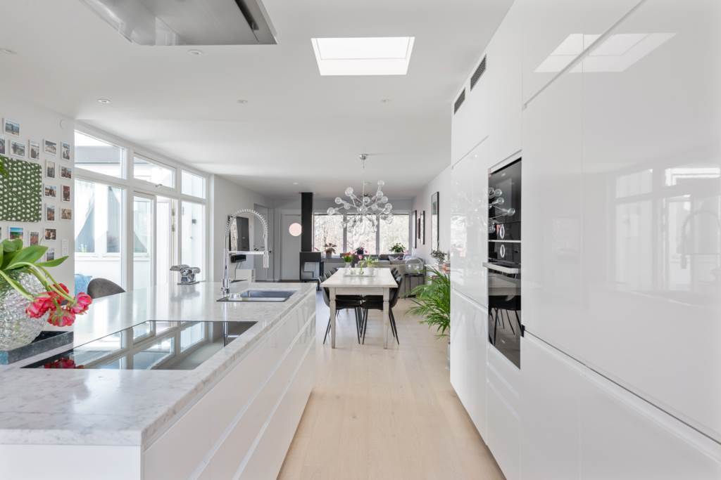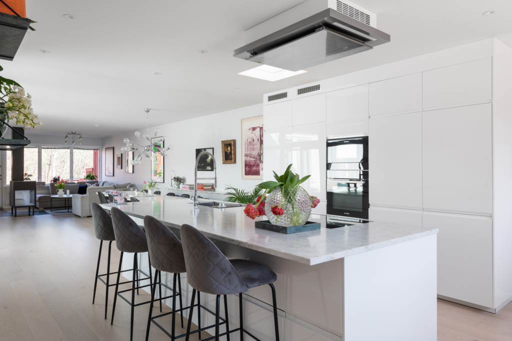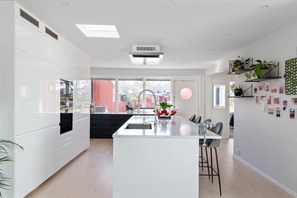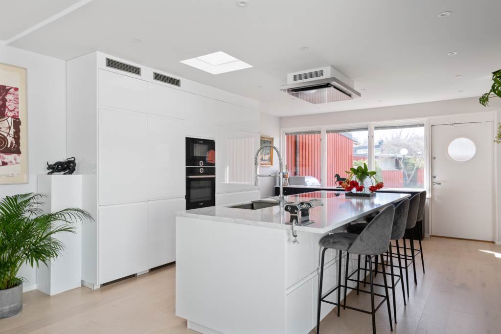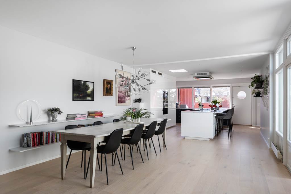 Rymligt kök med fantastiska arbetsytor och förvaring. Köksö med bänkskiva i marmor. Vita skåpluckor och vitvaror från Bosch. Fint ljusinsläpp från de stora fönsterpartierna med utsikt över den grönskande uteplatsen. Matplats med plats för ett tiotal personer. Ekgolv och ljusa väggar. Utgång till härlig uteplats i syd/västläge.