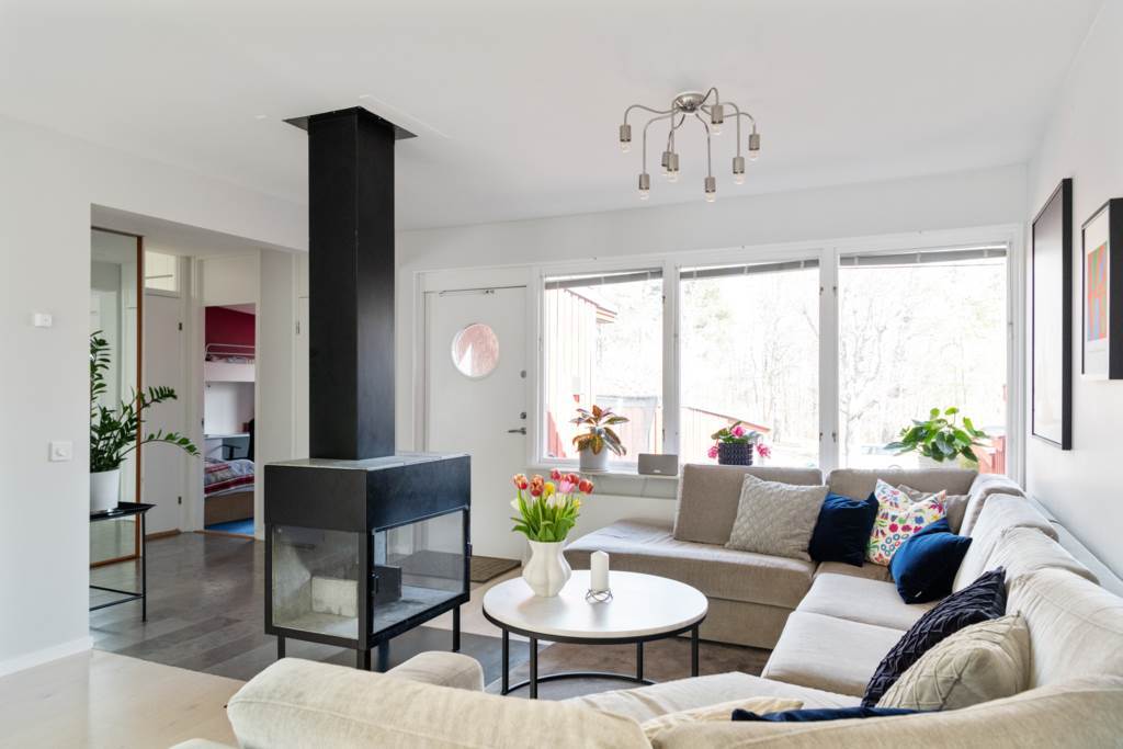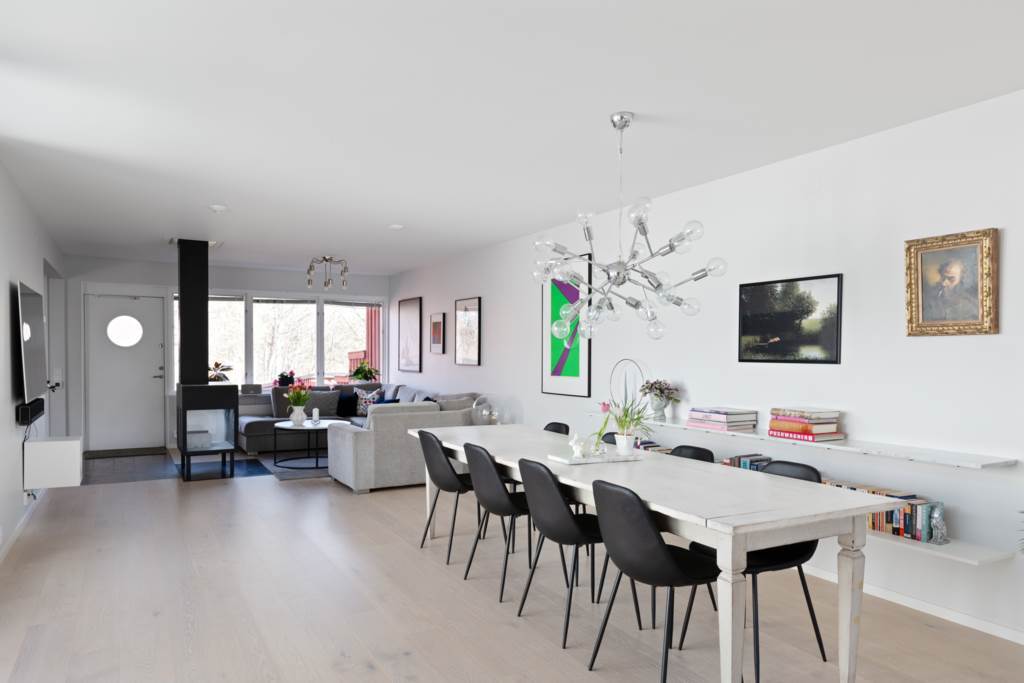 Stort vardagsrum med plats för ett möbelarrangemang. Fint ljusinsläpp från de stora fönsterpartierna. Öppen spis som adderar det där lilla extra. Vackert ekgolv och ljusa väggar.
