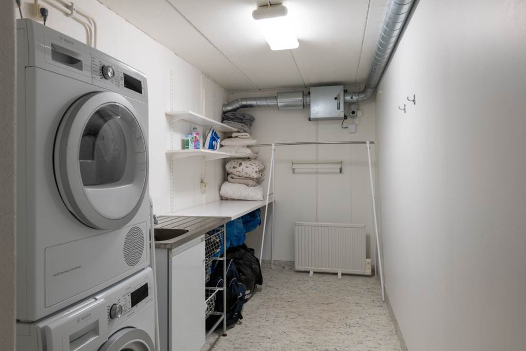 Rymlig tvättstuga med torktumlare och tvättmaskin från Bosch. Bra arbetsytor och förvaring. Vit plastmatta och vit kulör klär väggarna.