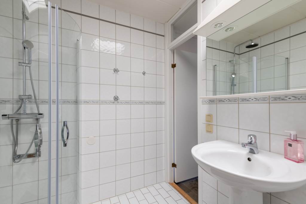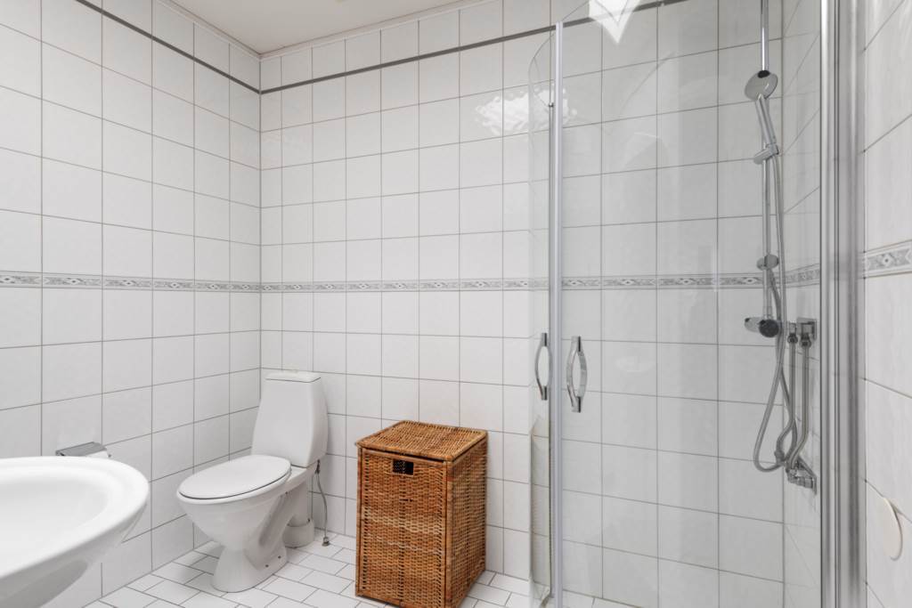 Praktiskt badrum med wc, dusch och handfat. Inbygggd förvaring. Vitt kakel och klinker. (Golvvärme el) . Takfönster som adderar fint ljus.