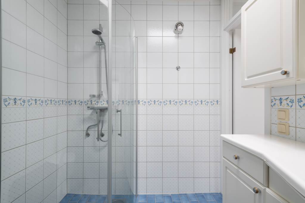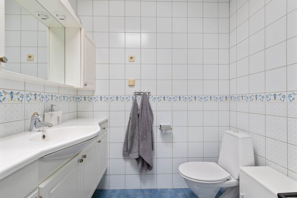 Wc, dusch och handfat med förvaring. Vit/blått mönstrat kakel och grå klinker.