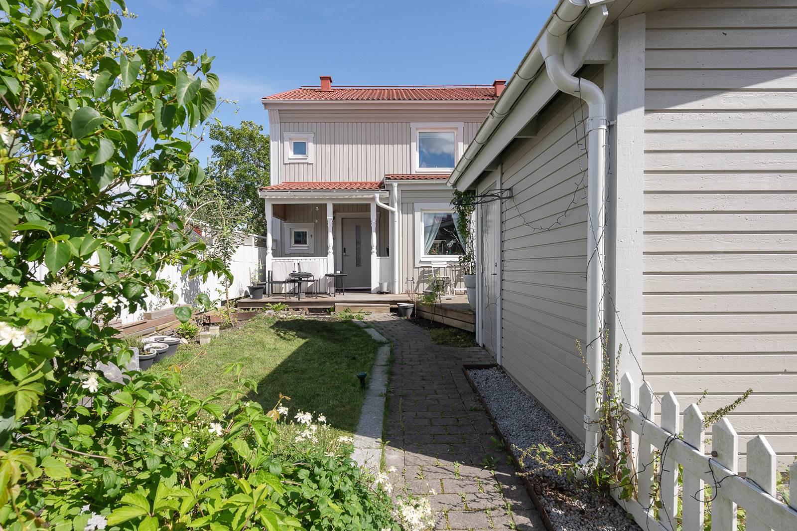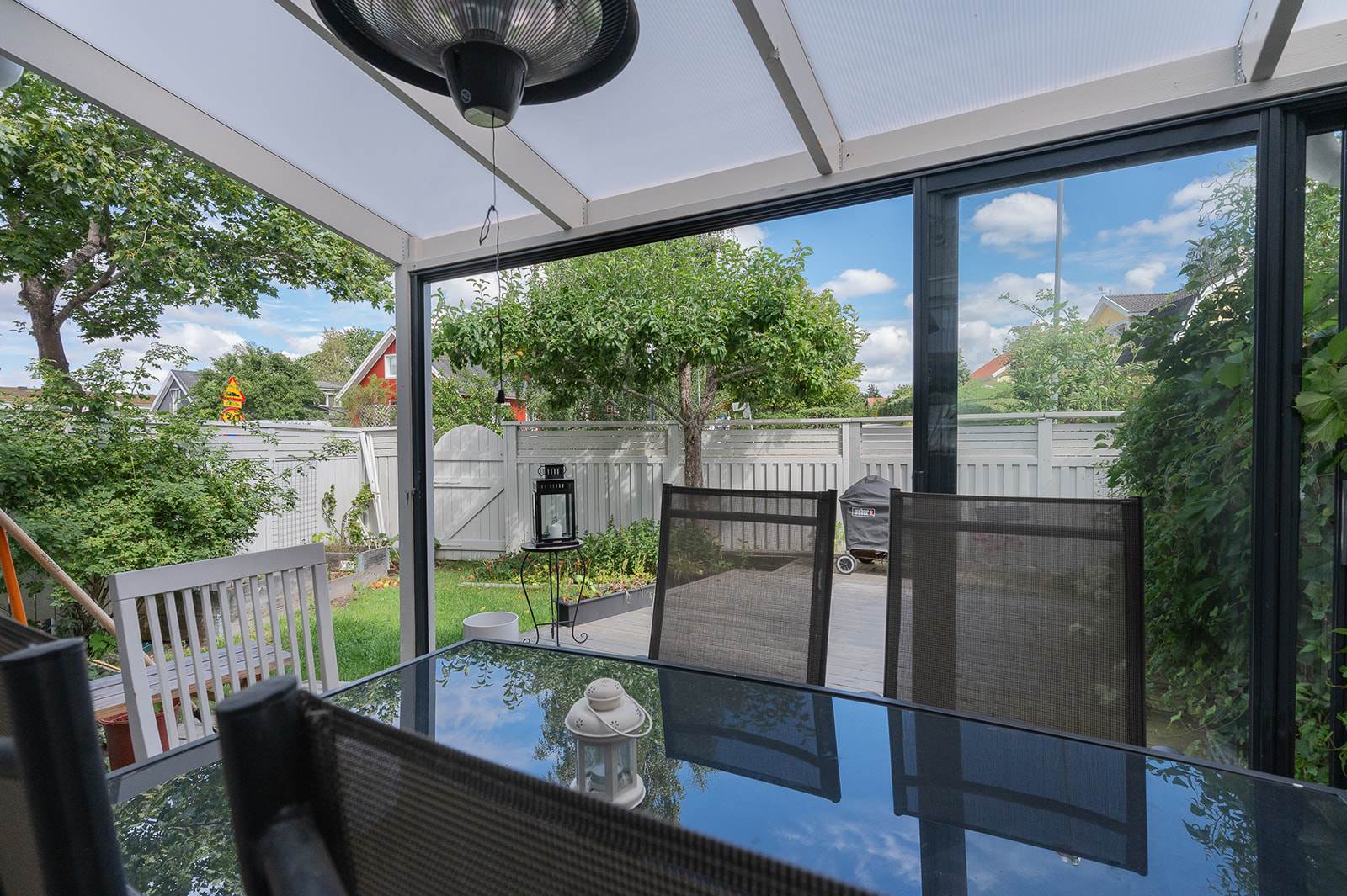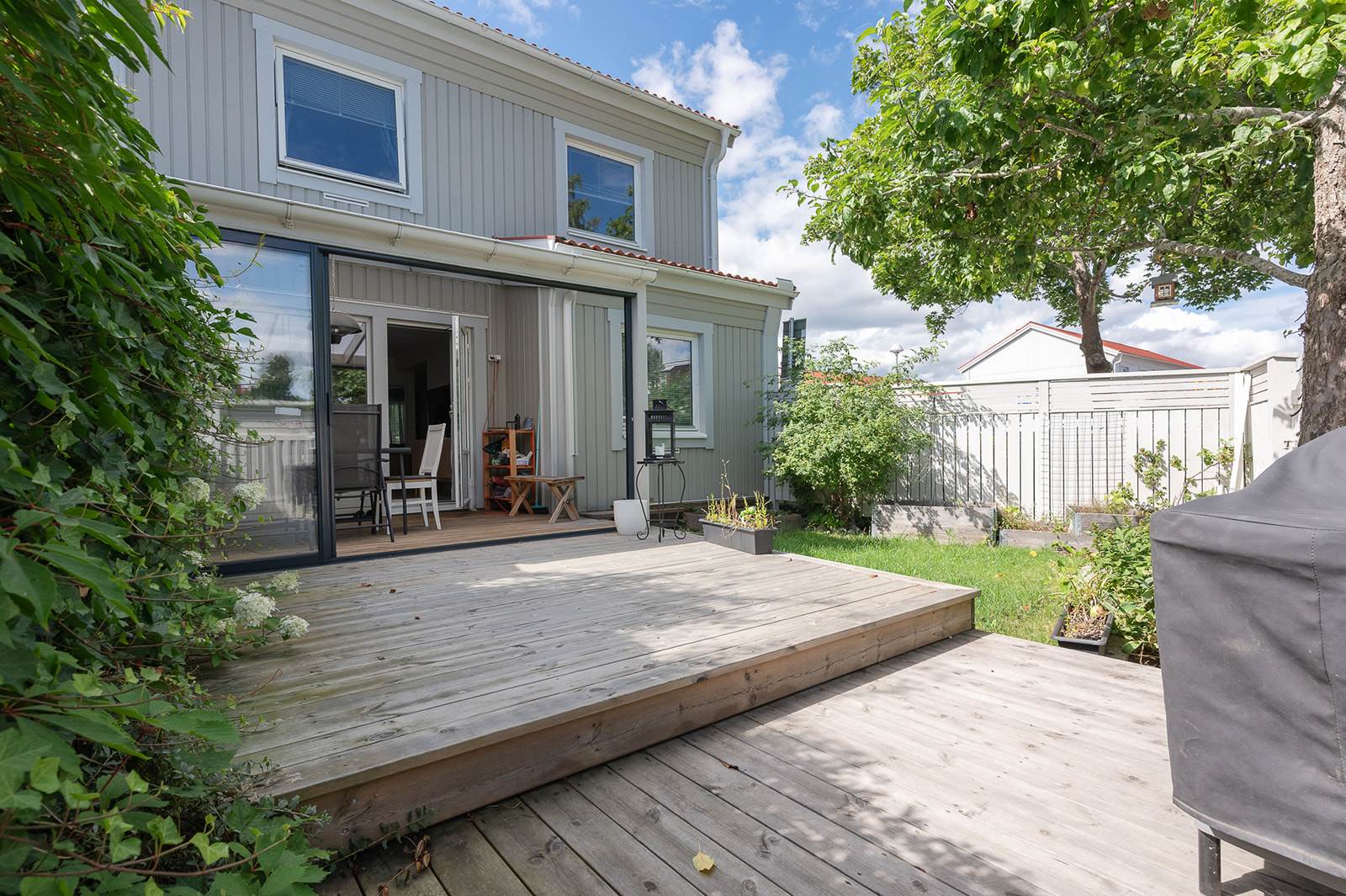 Bostaden erbjuder en genomtänkt planlösning med ljusa och luftiga ytor. Här finns gott om plats för både familjeliv och sociala tillställningar. Från vardagsrummet når du en av bostadens två uteplatser, perfekt för morgonkaffet eller avkoppling i solen. På husets andra sida finns ytterligare en uteplats – idealisk för eftermiddagssol och trevliga grillkvällar.