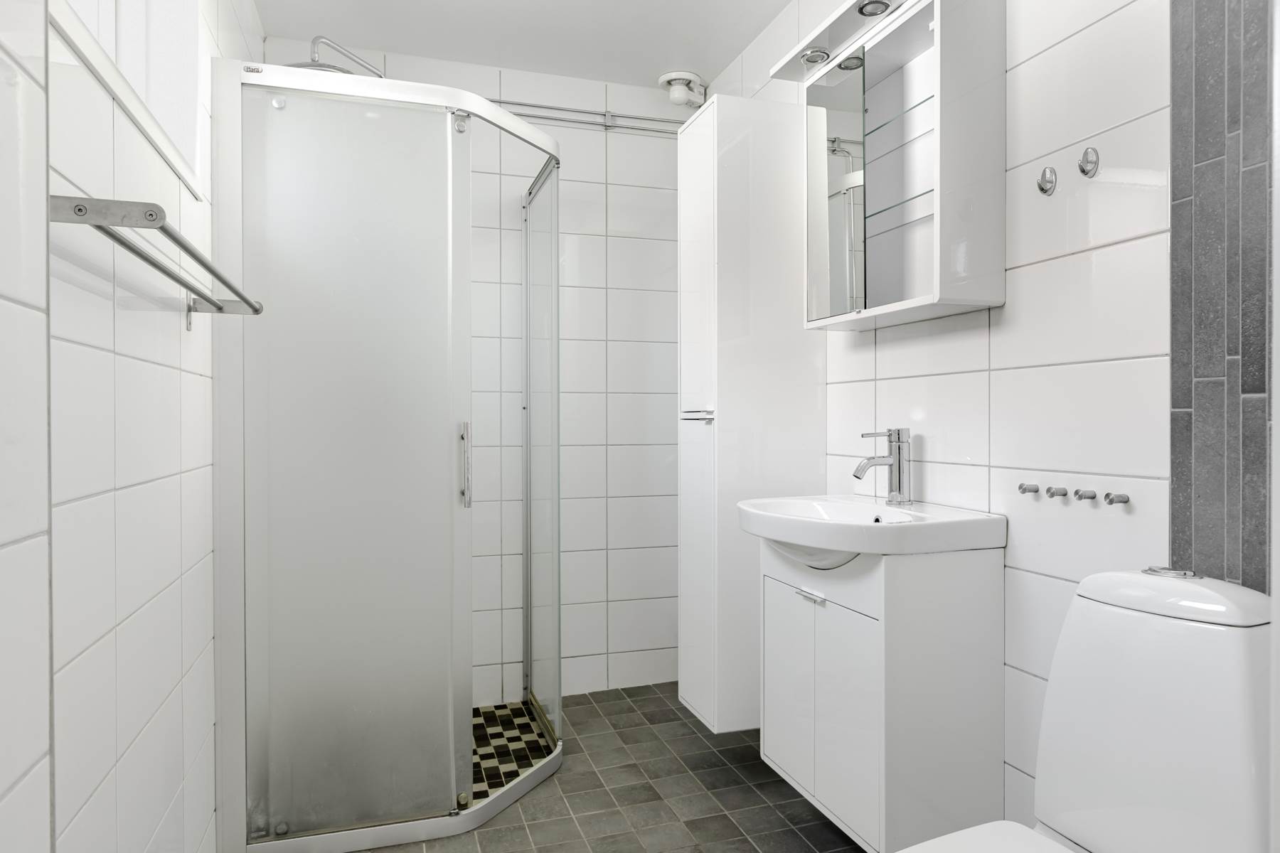Klinkergolv, väggskivor för våtrum, dusch med skjutdörrar, handfat i kommod, väggskåp, högskåp och toalett.