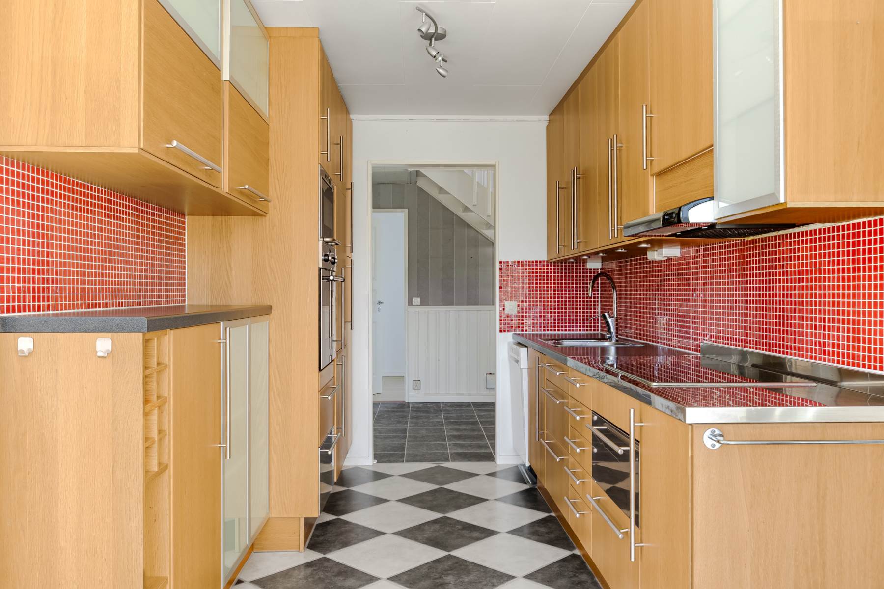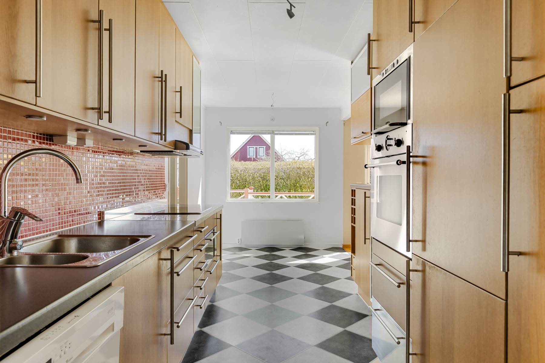 Laminatgolv, köksinredning i ek och väggkakel i mosaik. Den maskinella utrustningen består av spishäll, fläkt, dubbla ugnar, micro och diskmaskin.