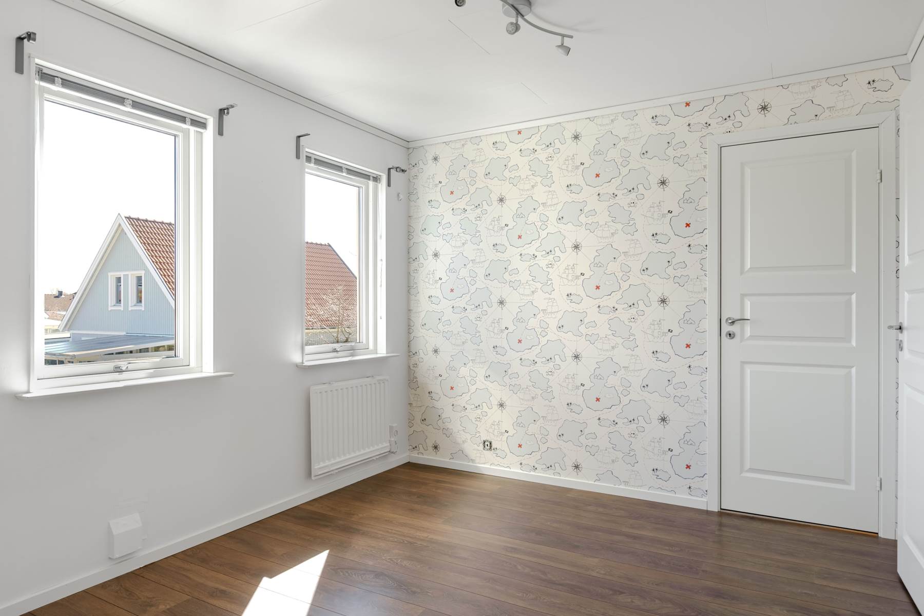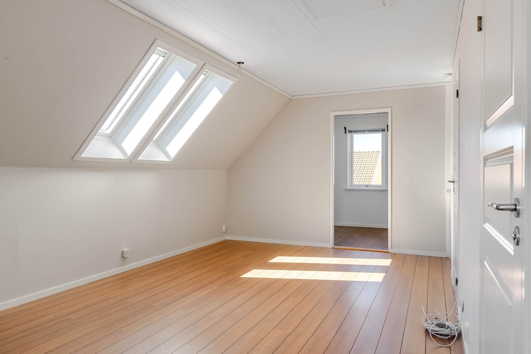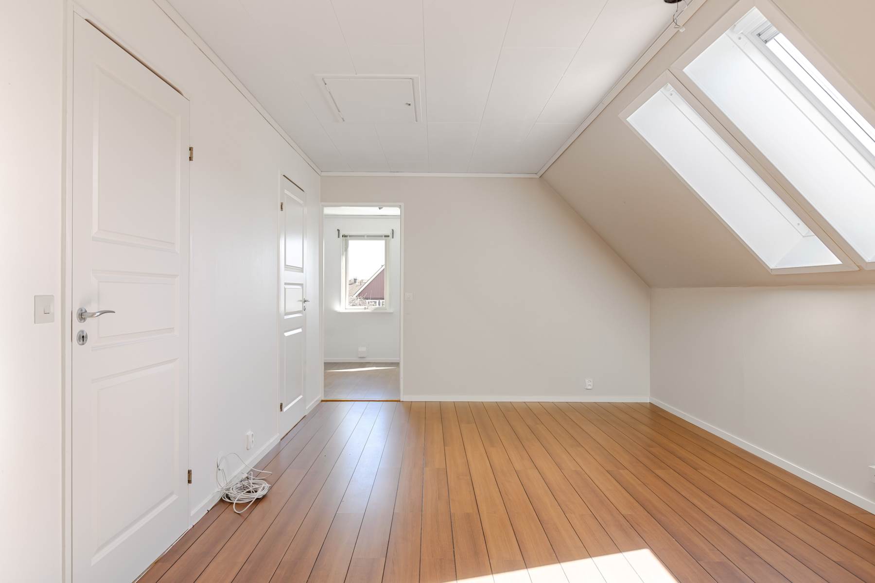 Laminatgolv, tapetserade väggar och härligt ljusinsläpp genom takfönstren.
