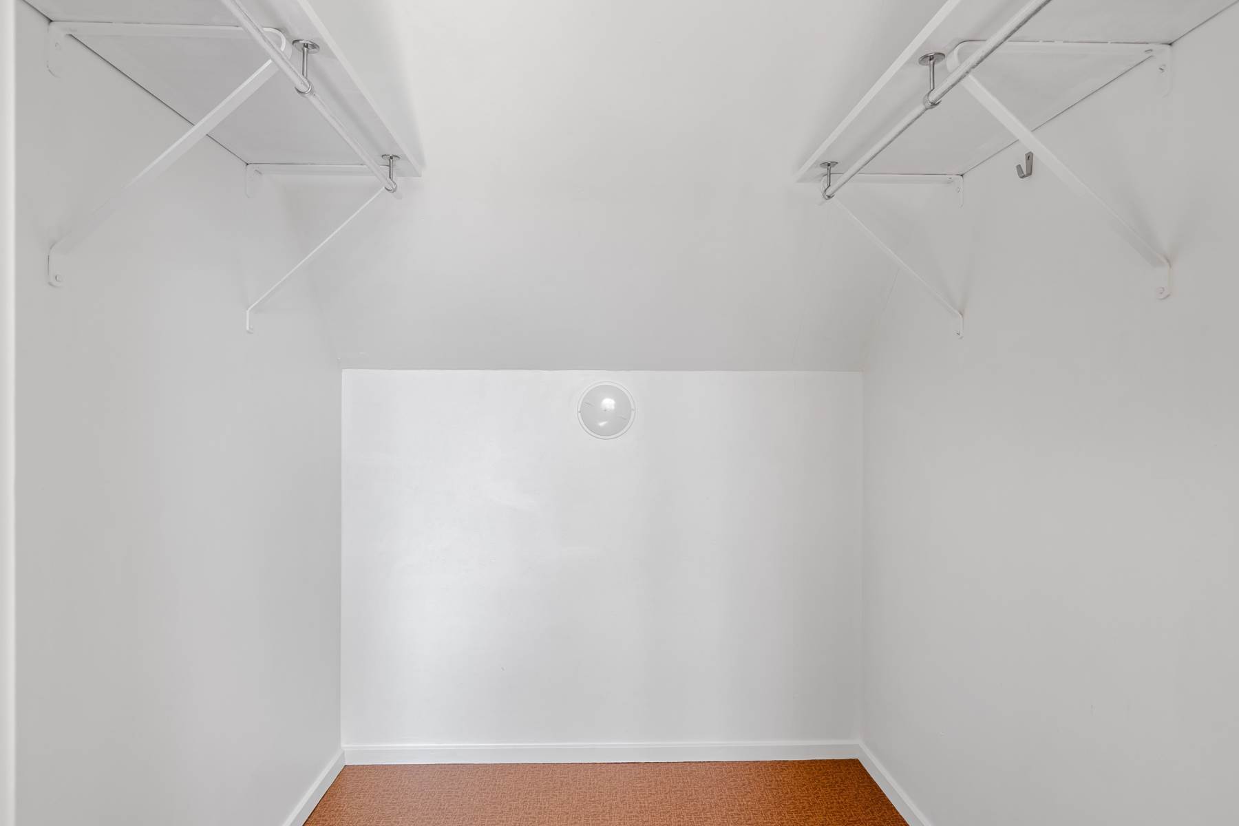 Laminatgolv, tapetserade väggar och en klädkammare.