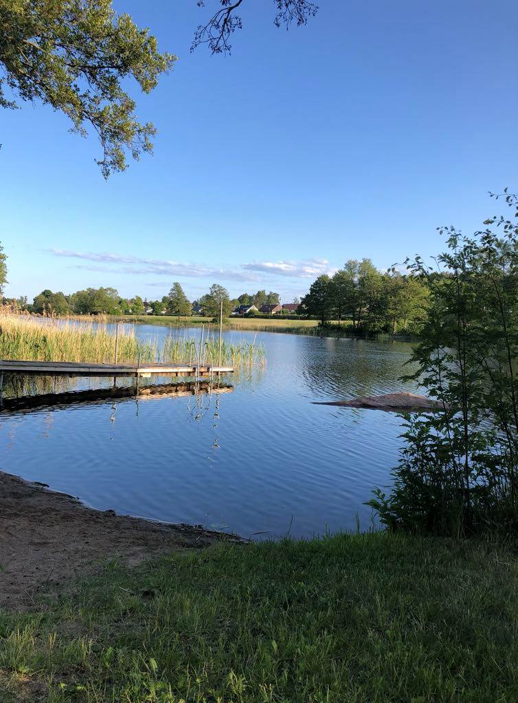 På bekvämt gångavstånd finns både badbrygga och en barnvänlig sandstrand vid Stångån.