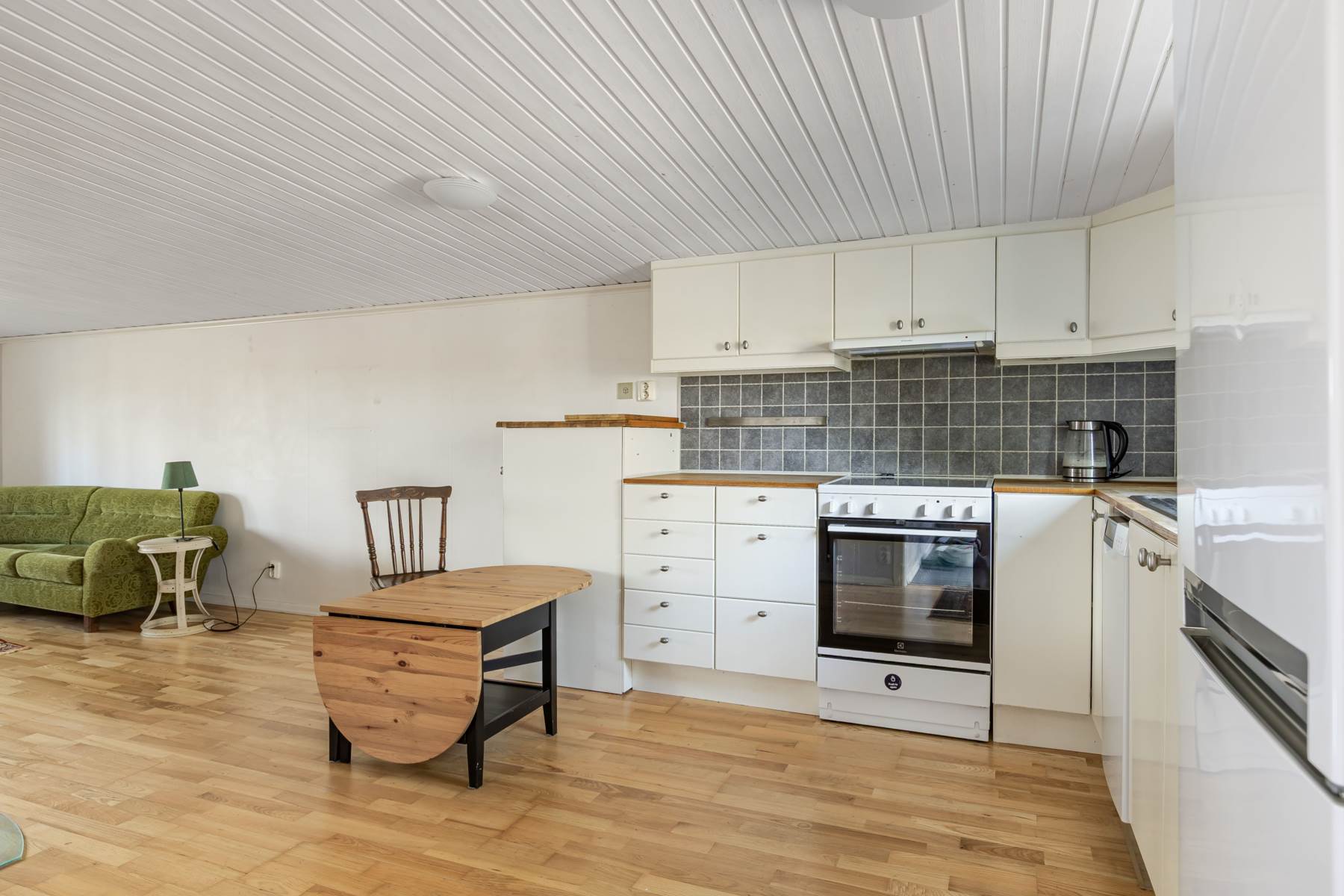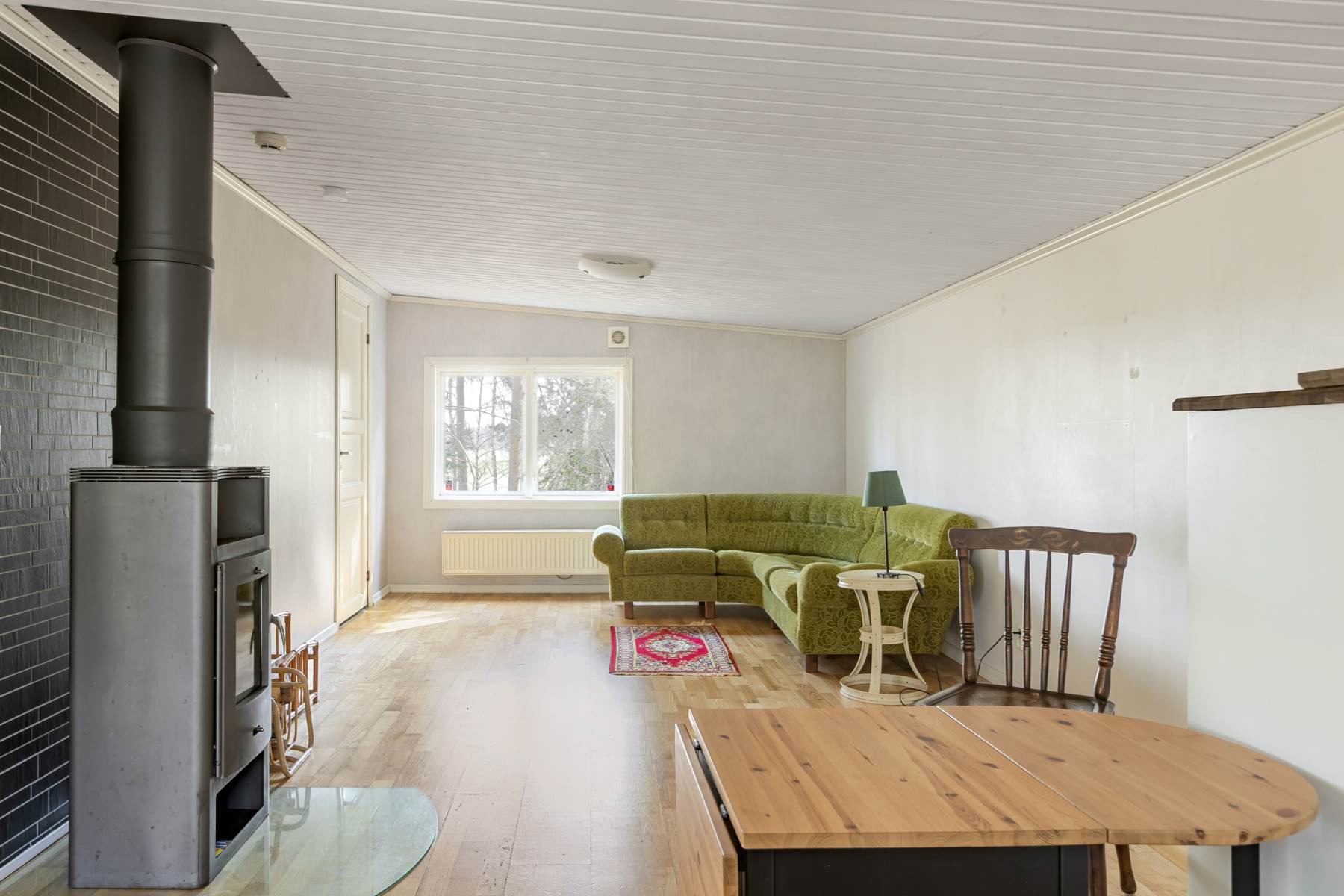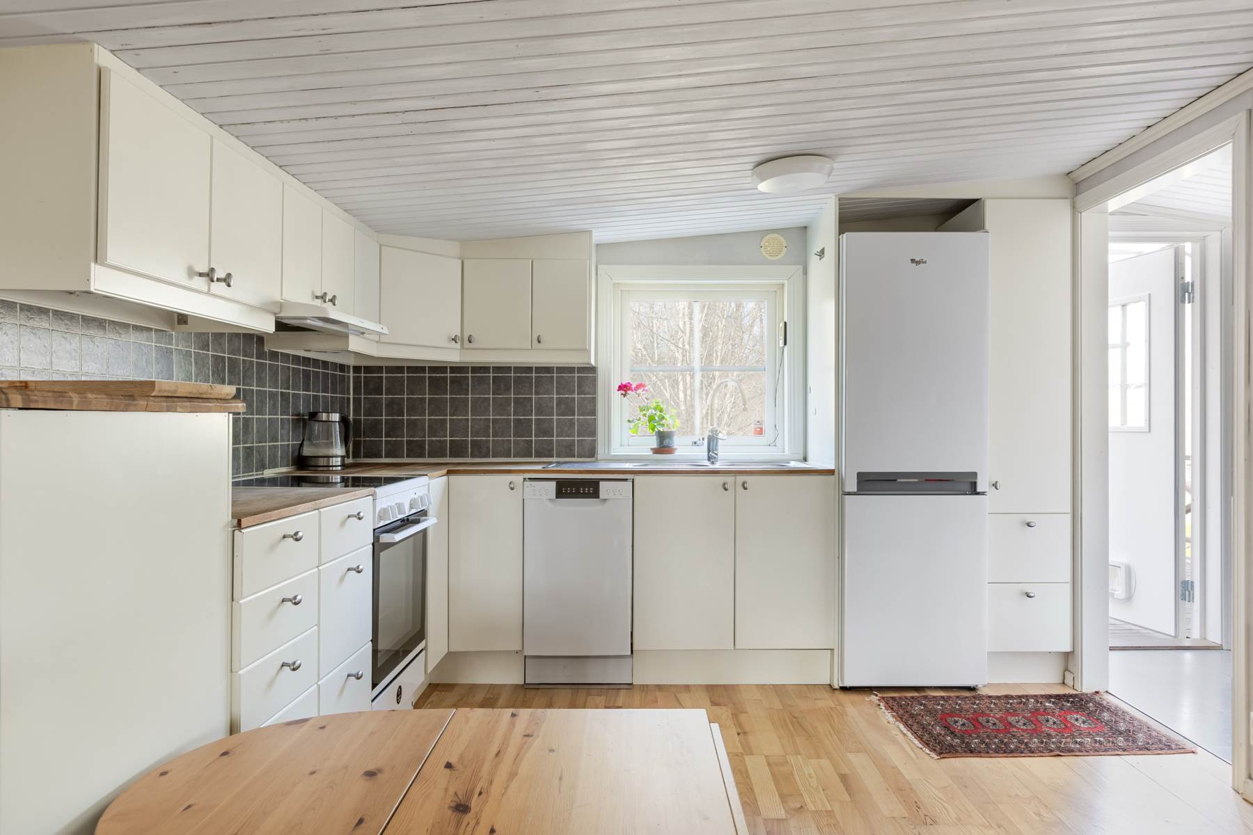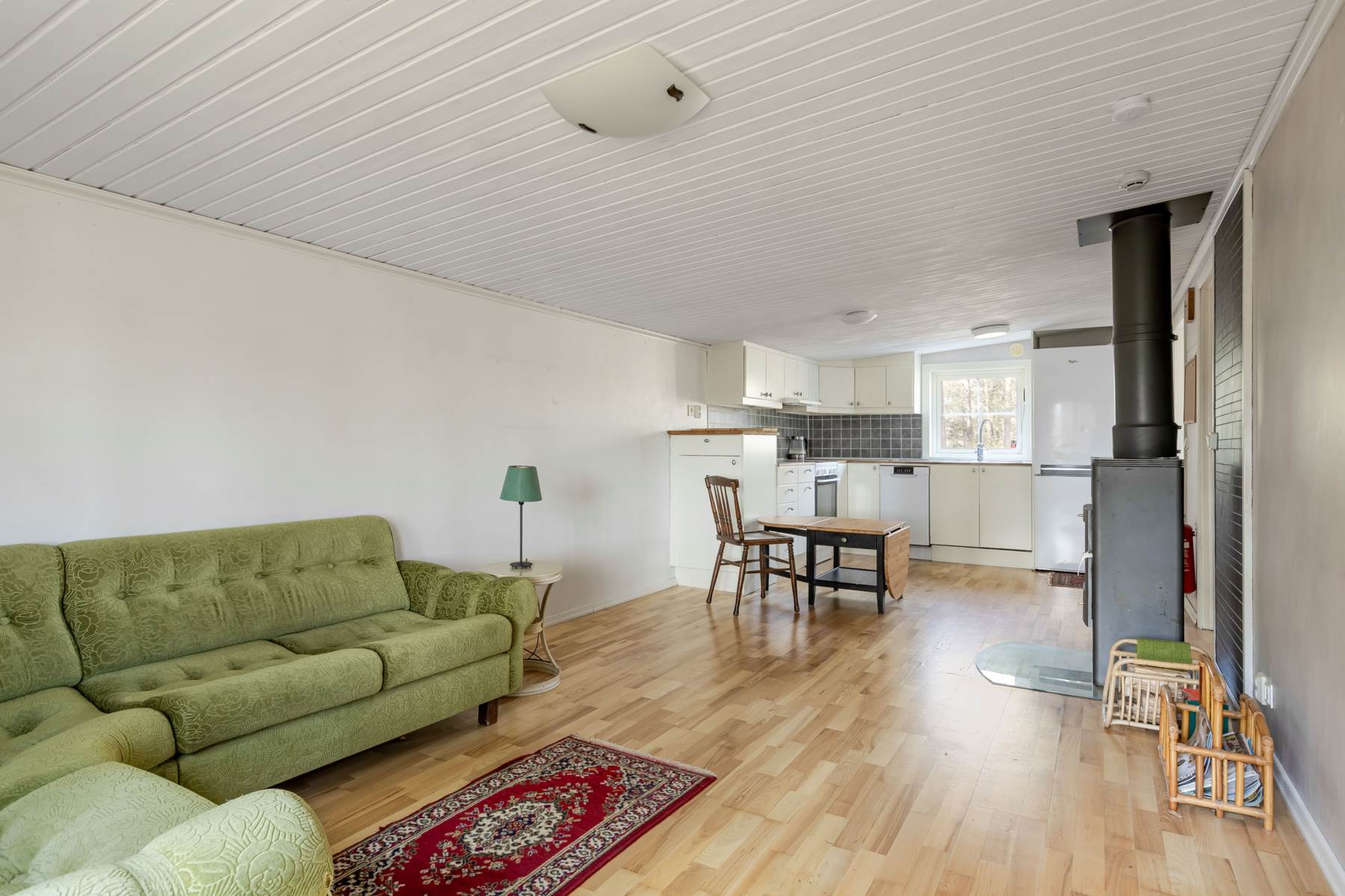 Stugan lämpar sig för permanentboende och erbjuder ett fullutrustat kök i öppen planlösning mot vardagsrummet samt vedkamin. De generösa fönsterpartierna ger ett fint ljusinsläpp och skapar en inbjudande atmosfär. Det mysiga sovrummet rymmer både säng och en mindre läshörna för lugna stunder. I badrummet finns duschkabin, kombinerad tvättmaskin/torktumlare, handfat och en mulltoa.