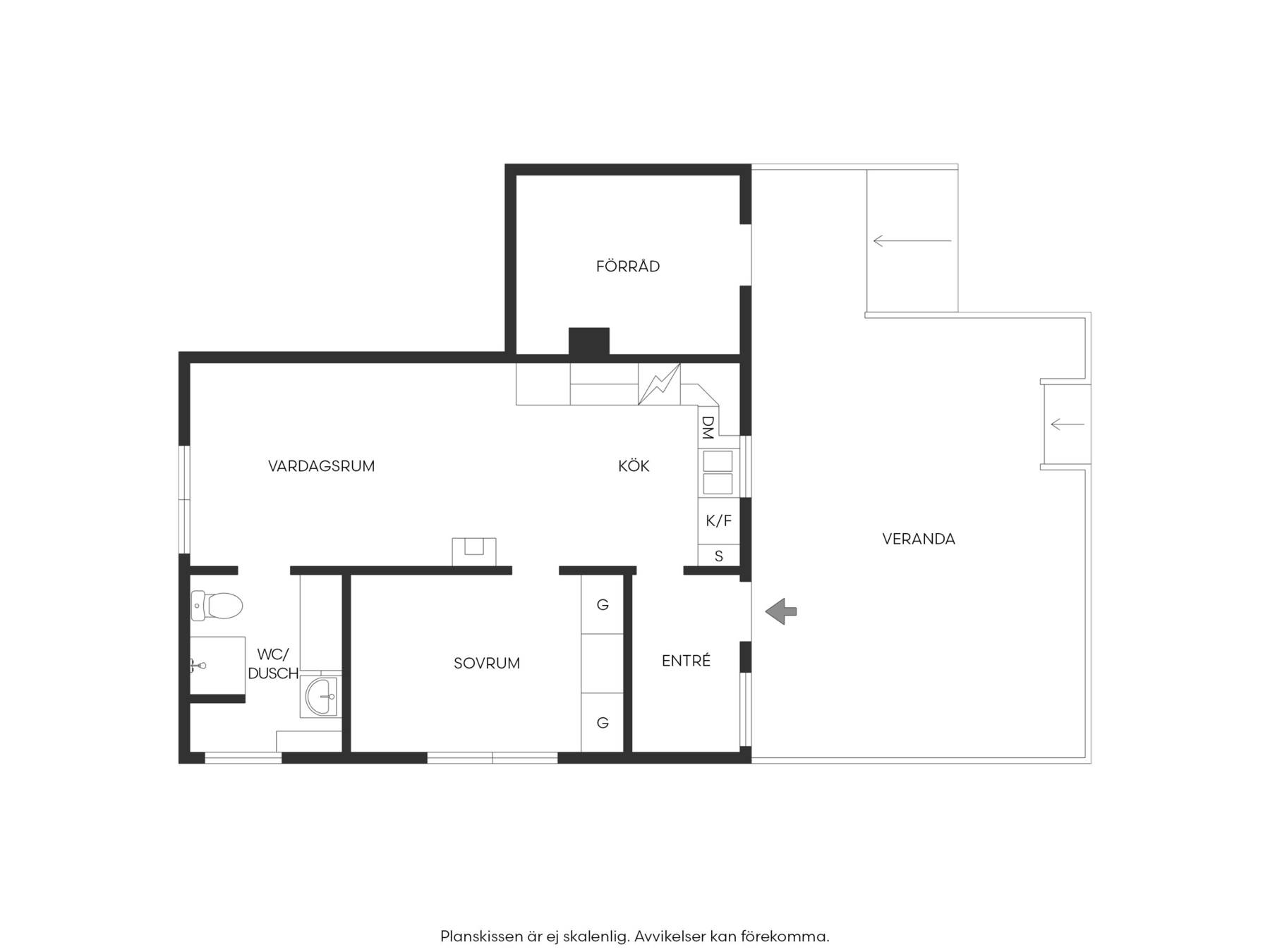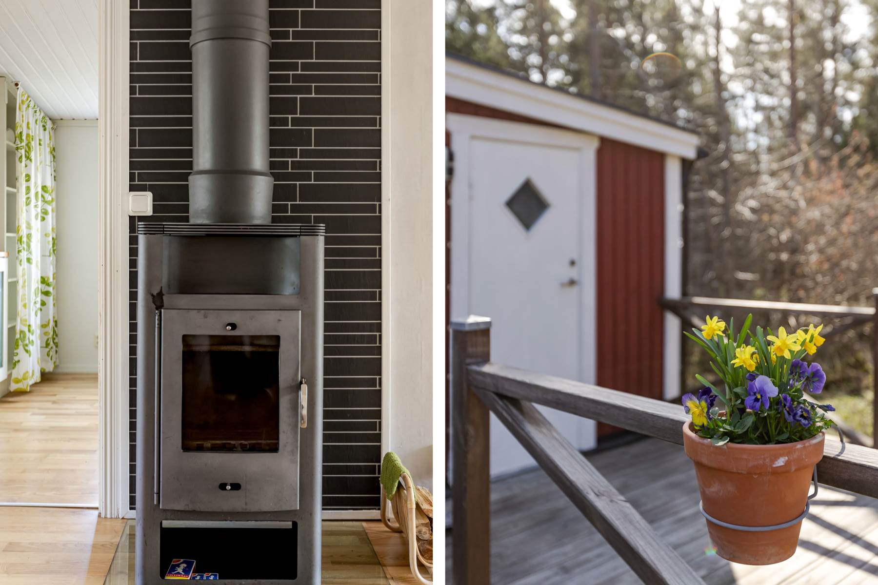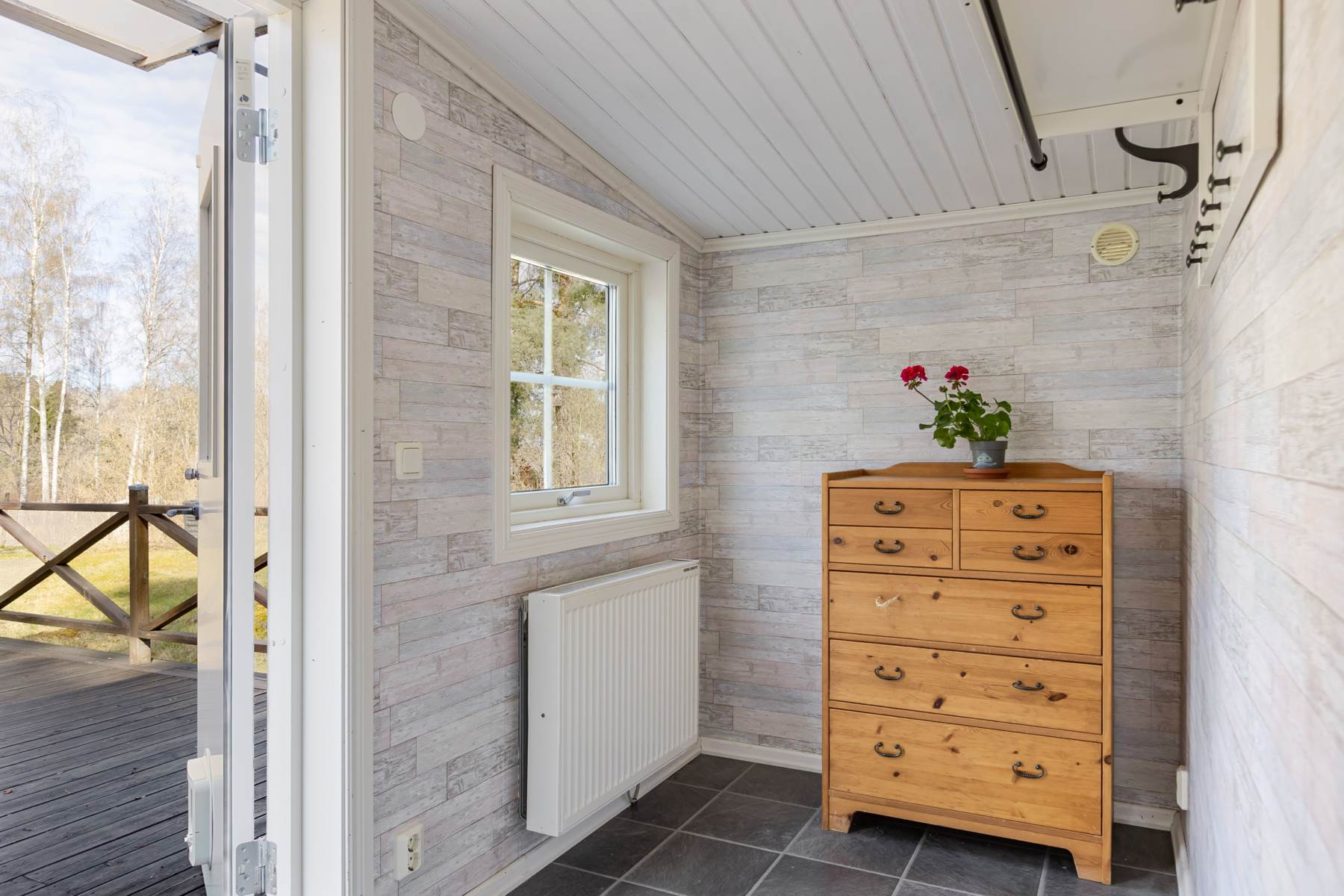 Stugan har ett isolerat förråd med egen ingång via altanen, en redskapsbod på baksidan och ett litet vedskjul.