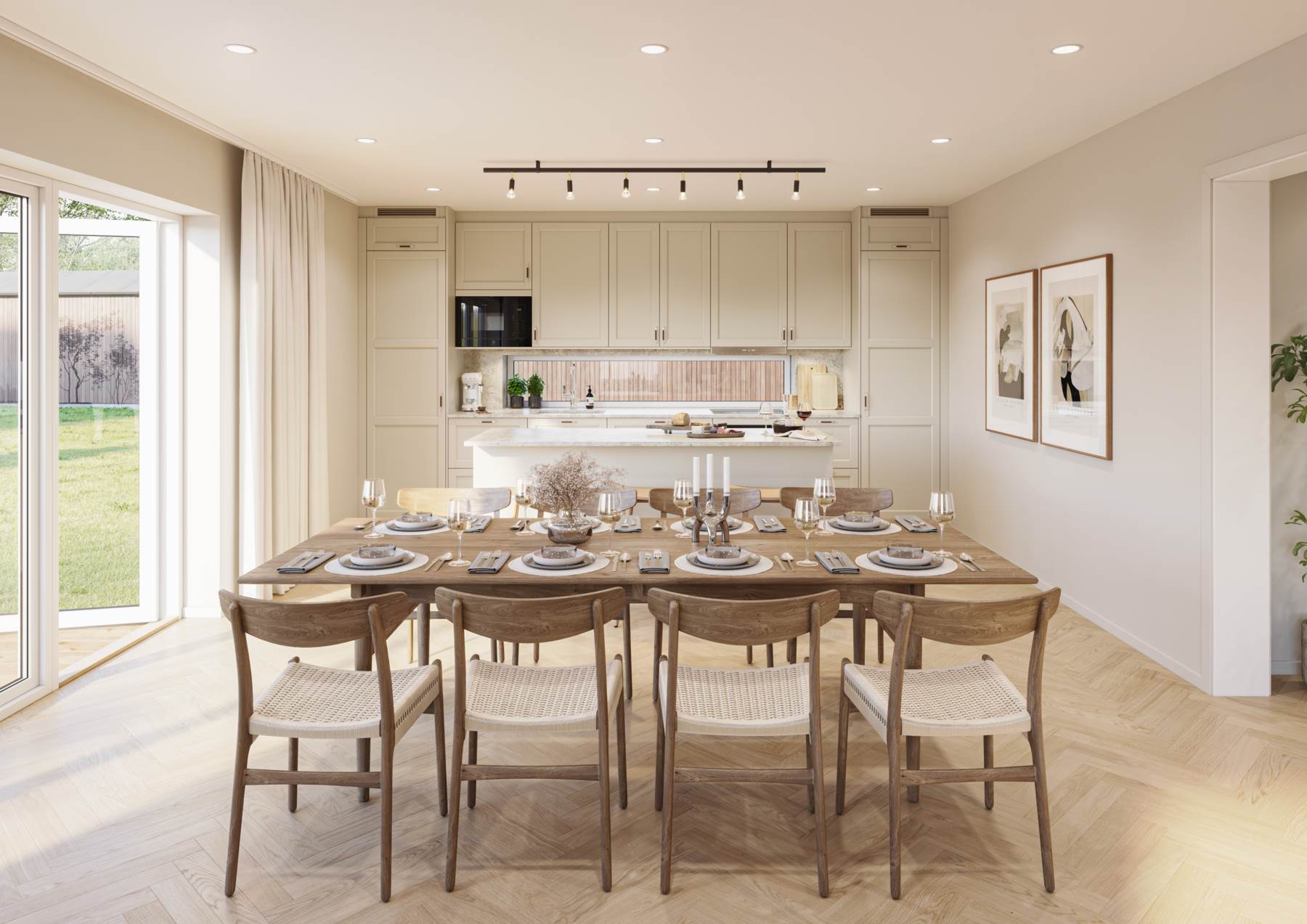 Bostäderna i Brf Danderyd Park präglas av ett tydligt kvalitetsfokus – här är material och utförande lika genomtänkta som arkitekturen. Köken är byggda med snickerier från Ballingslöv med stenskivor från Cosentino och kromade detaljer med läderinfattning för en exklusiv finish. Vitvaror kommer från Electrolux och integreras stilrent i inredningen för ett sammanhållande uttryck. I badrummen återkommer samma premiumkänsla med kakel och klinker från Bricmate, armaturer från Tapwell. Golvmaterialen är valda med omsorg. Parhusen har exklusiv fiskbensparkett från Bjelin vilket ger en varm och tidlös bas. Trappor i massiv ek, målade snickerier och harmoniska kulörer knyter samman helheten och ger en lugn och elegant atmosfär. Belysningen är integrerad med spotlights och dimmer i samtliga rum, vilket förstärker ljuset från de stora fönsterpartierna och bidrar till den exklusiva känslan.