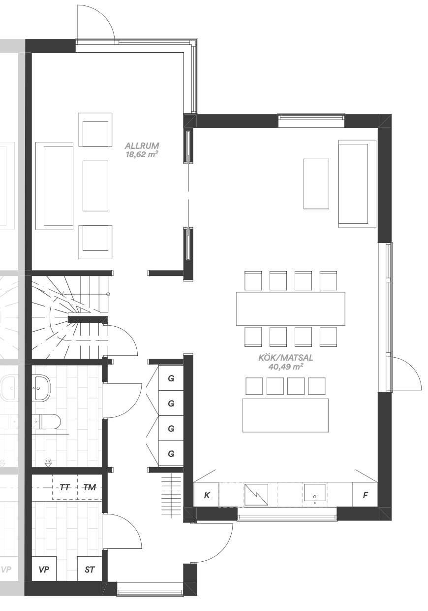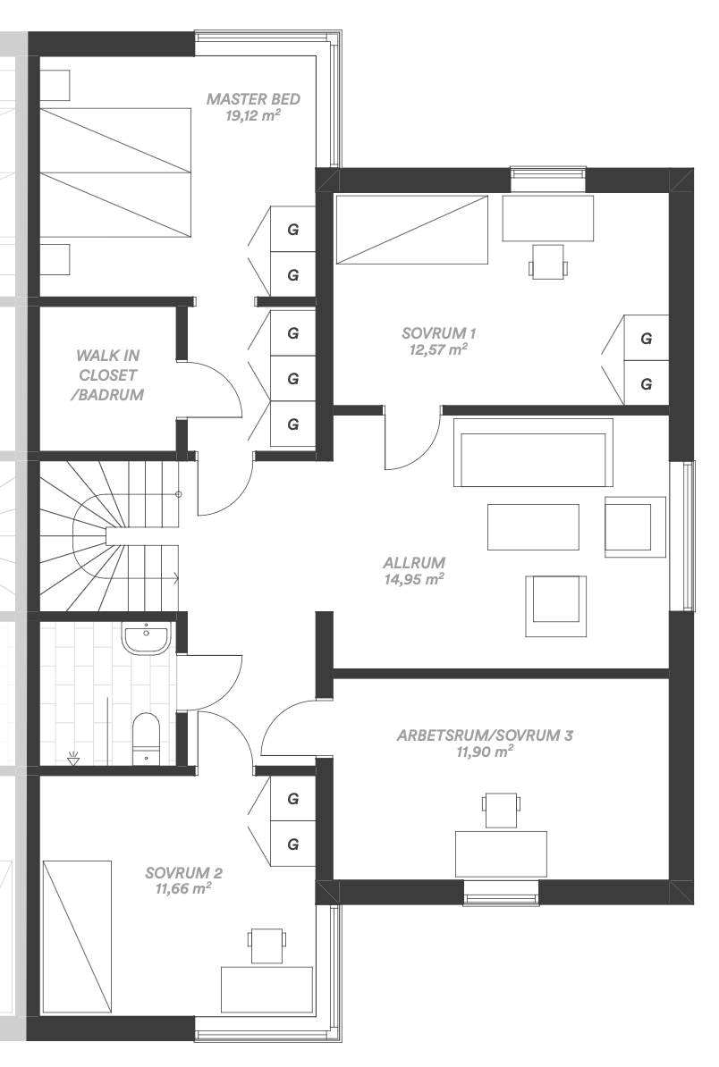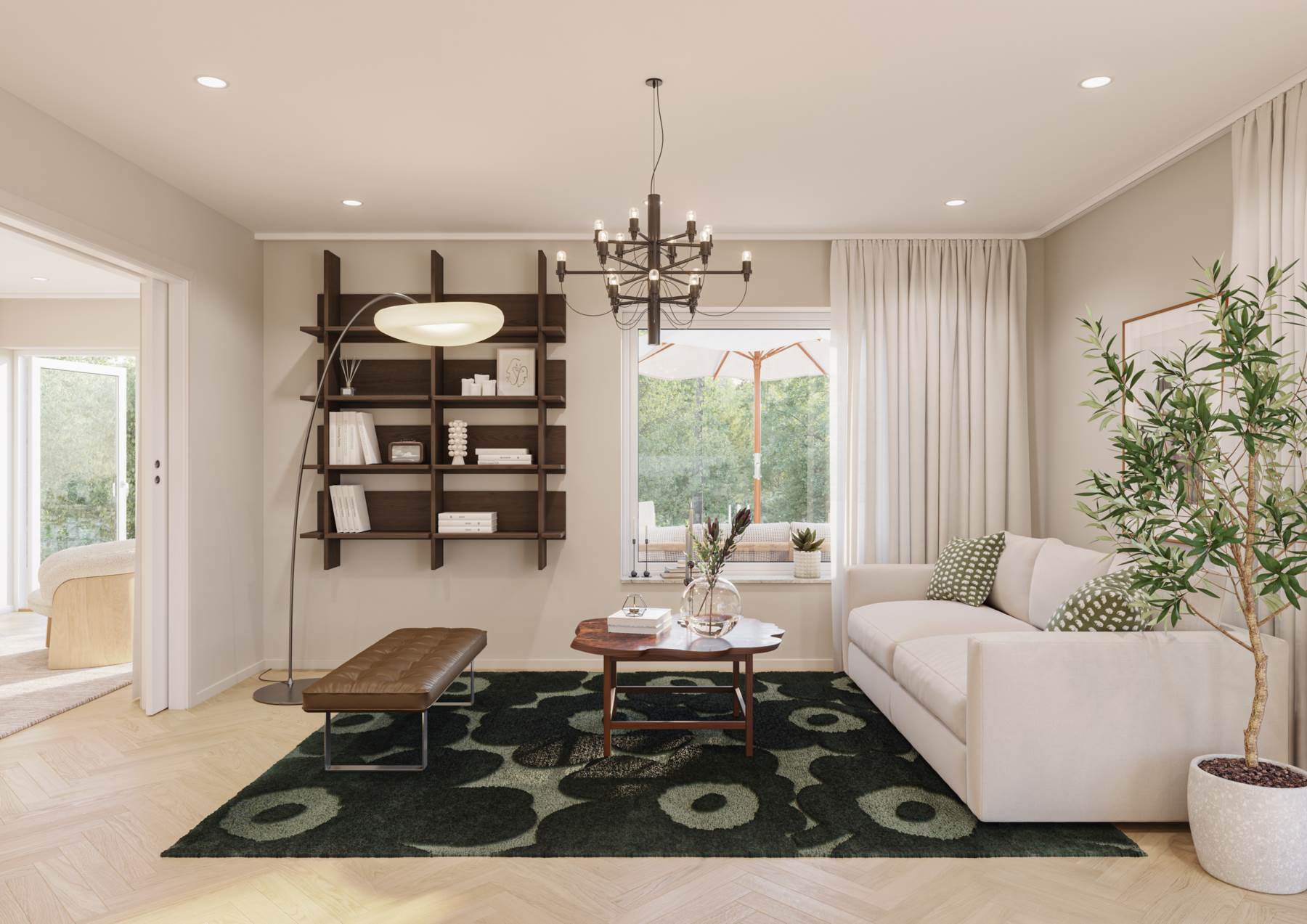 Minimalistisk design kombineras med ett tydligt kvalitetsfokus där naturmaterial och omsorgsfulla detaljer skapar en harmonisk och stilren boendemiljö. Planlösningen erbjuder tydliga sociala ytor på entréplanet och privata rum på övre plan, vilket skapar en smart och trivsam vardag.