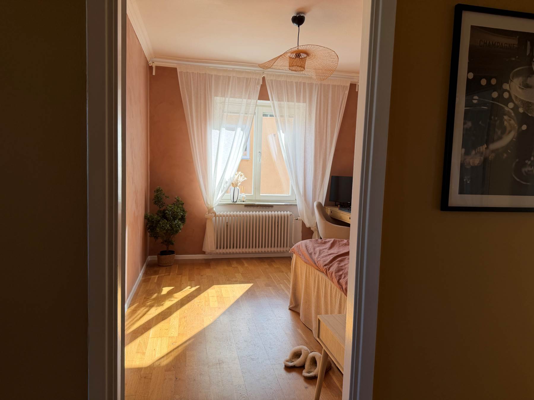 Bostaden erbjuder tre välplanerade sovrum, samtliga utrustade med elektroniska rullgardiner som styrs via konsol. Det större sovrummet har direkt utgång till den inglasade balkongen. Under sommarhalvåret njuter du här av sista kvällssolen (norrläge) med utsikt över innergårdens grönska, en självklar plats för middagar.