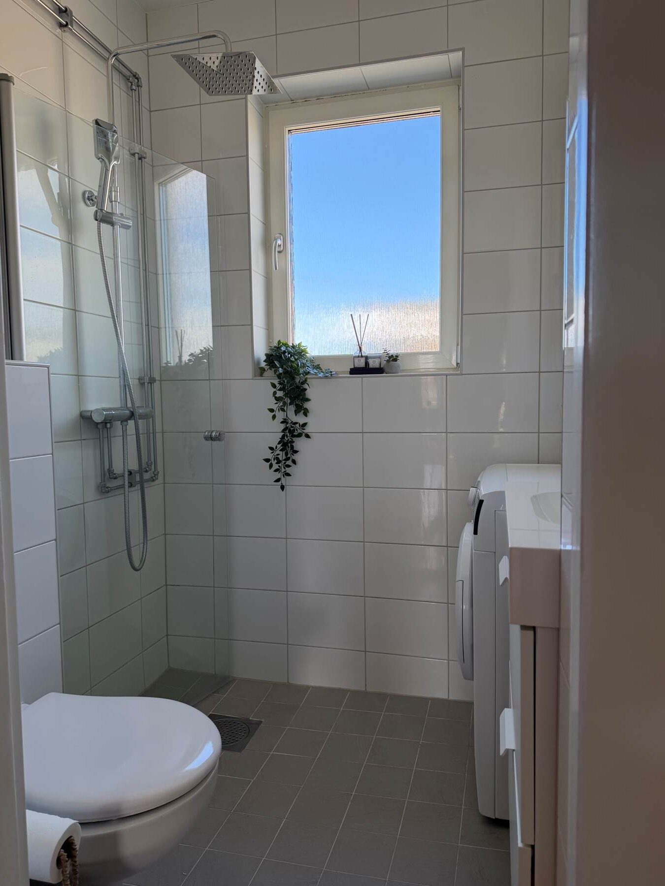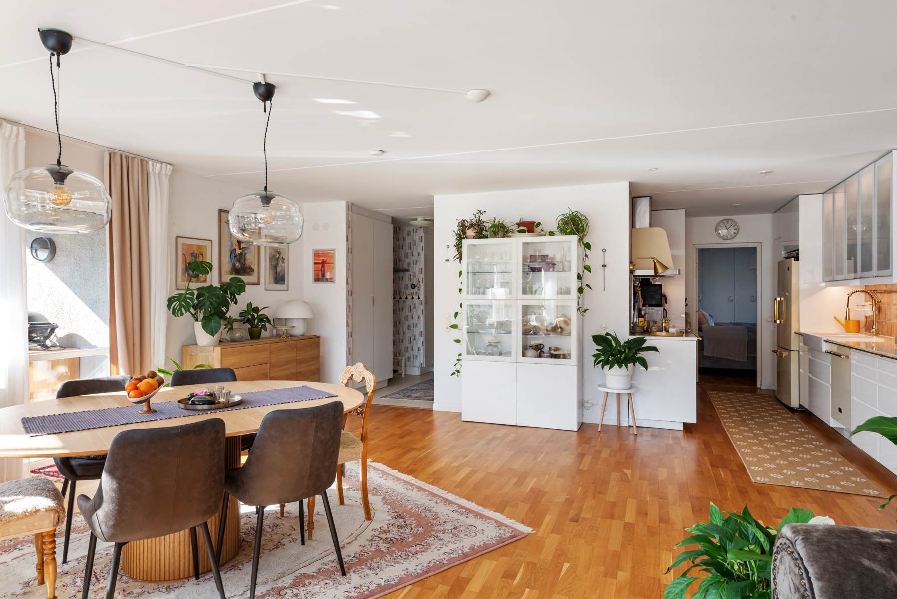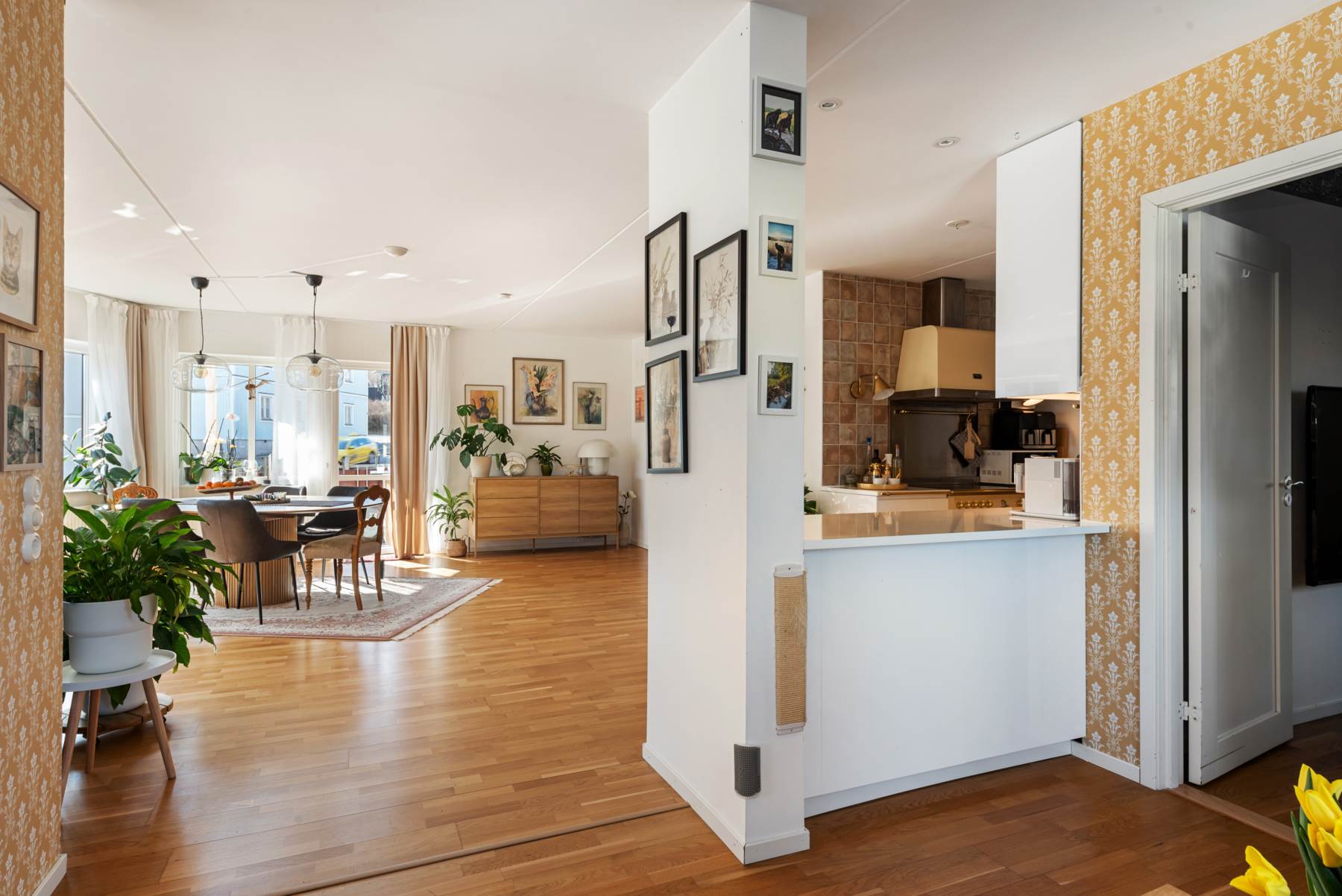 Till vänster finner vi ett rymligt, helkaklat duschrum i moderna och stilrena kulörer. Vidare öppnar bostaden upp sig mot det nyligen renoverade köket, smakfullt uppdaterat med exklusiva materialval, köksö och påkostade vitvaror. Köksön binder naturligt samman kök och allrum och skapar en social och inbjudande planlösning. Här finns gott om plats för både större matbord och generös soffgrupp, en perfekt miljö för såväl vardagsliv som umgänge.