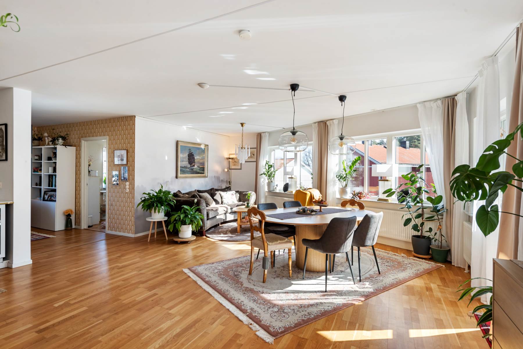Redan i hallen möts du av rymd och ljus. På entréplanet breder bostaden ut sig med vacker utsikt över stadens charmiga trähus och kullerstensgator, det som gör Norrtälje så unikt och levande.